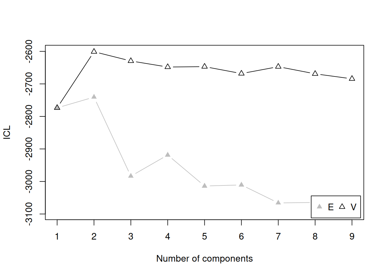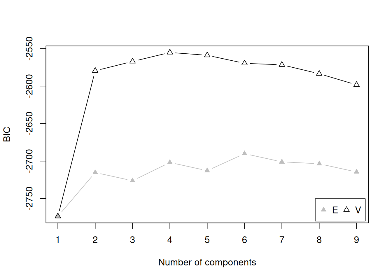 We can perform a cluster analysis using the mclust::mclustBIC(), mclust::mclustICL(), and mclust::mclustBootstrapLRT() functions of the mclust package (Fraley et al., 2024; Scrucca et al., 2023).