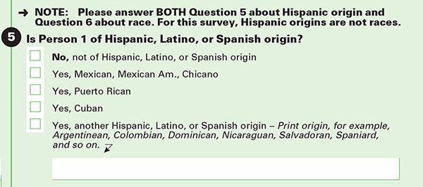 Labels by the 2020 U.S. Census attempt to be more precise than traditional classifications of race and ethnicity by the National Institutes of Health. For the classification of “Hispanic, Latino, or Spanish origin” in the 2020 U.S. Census, see Figure 25.1. Notice how the question distinguishes between identities of people from (or whose ancestors were from) various countries, including Mexico, Puerto Rico, Cuba, etc.