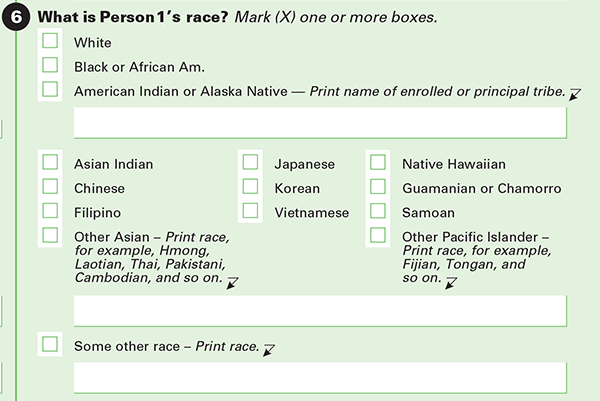 For the classification of “Race” in the 2020 U.S. Census, see Figure 25.2. Notice how the question distinguishes between identities of people from (or whose ancestors were from) various countries, including India, China, Philippines, etc.