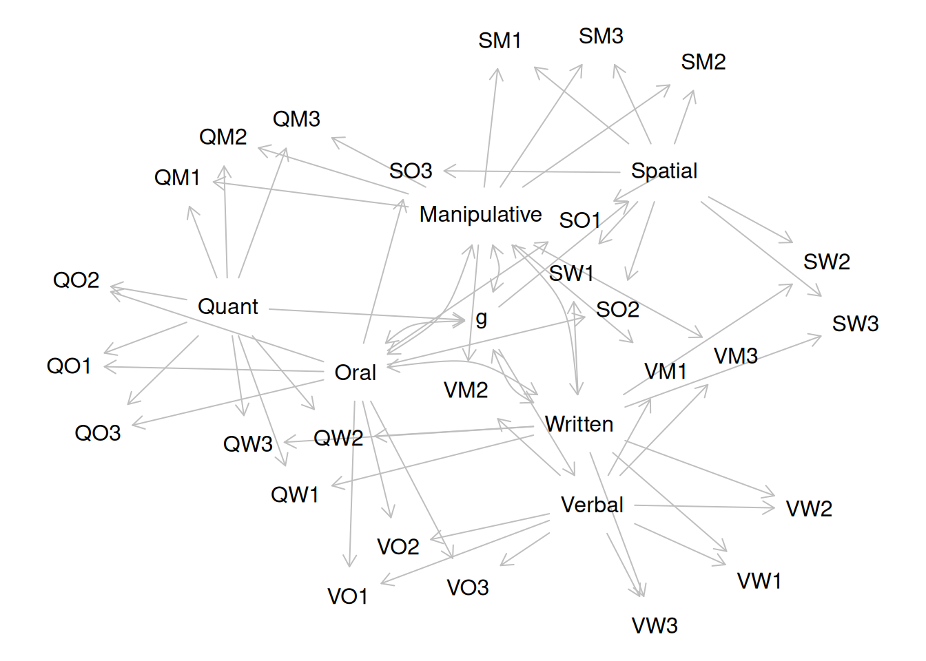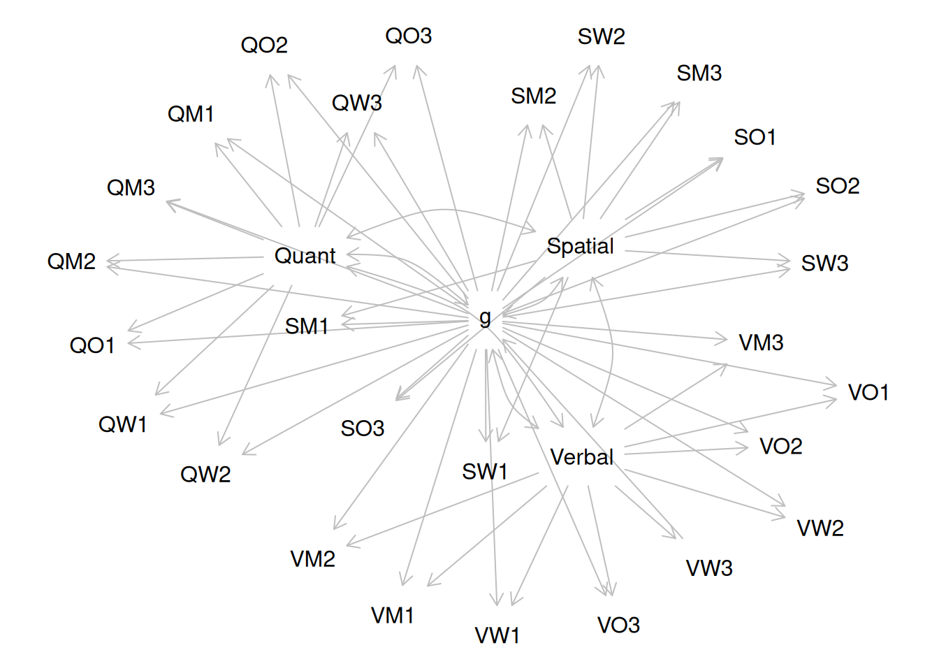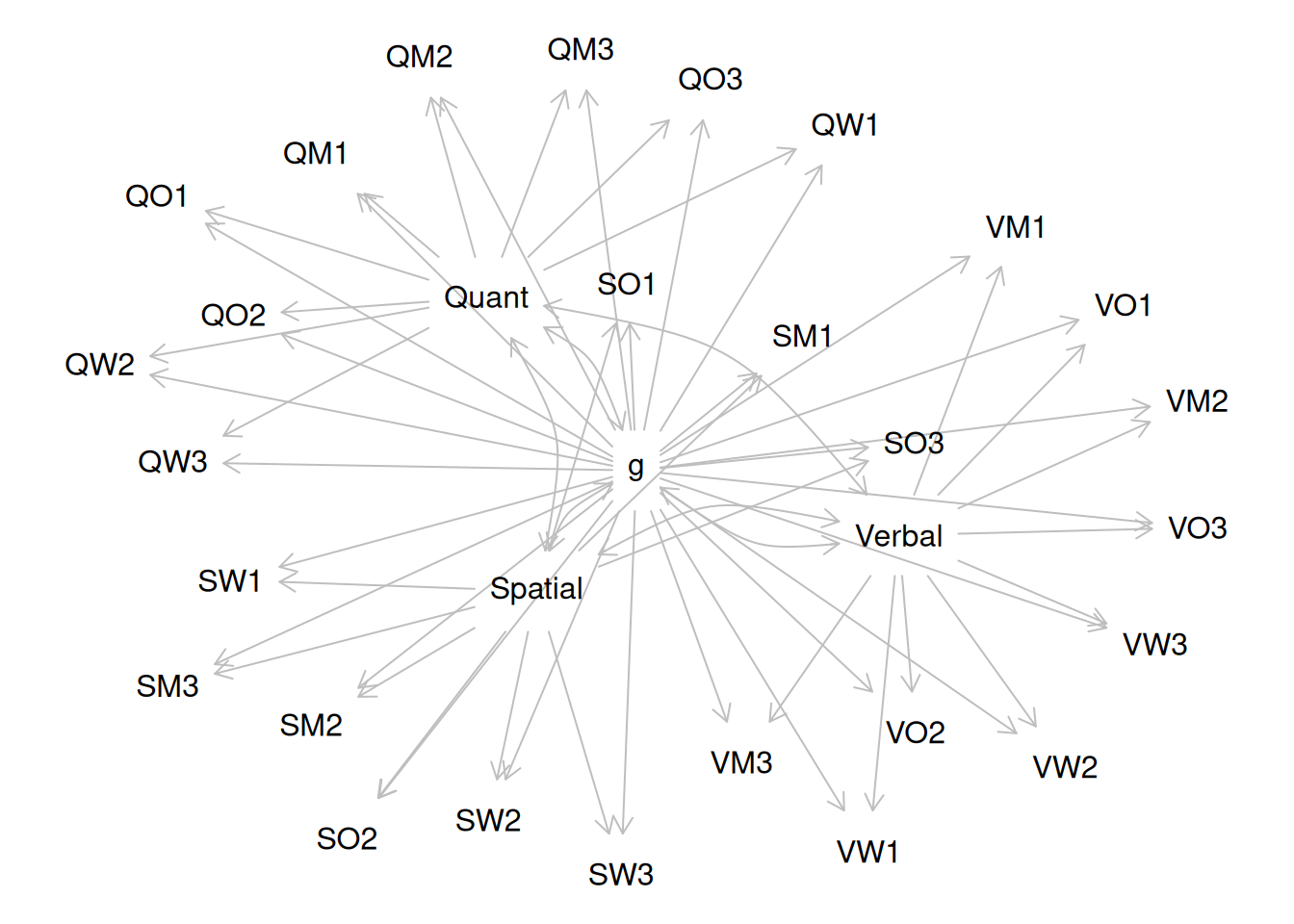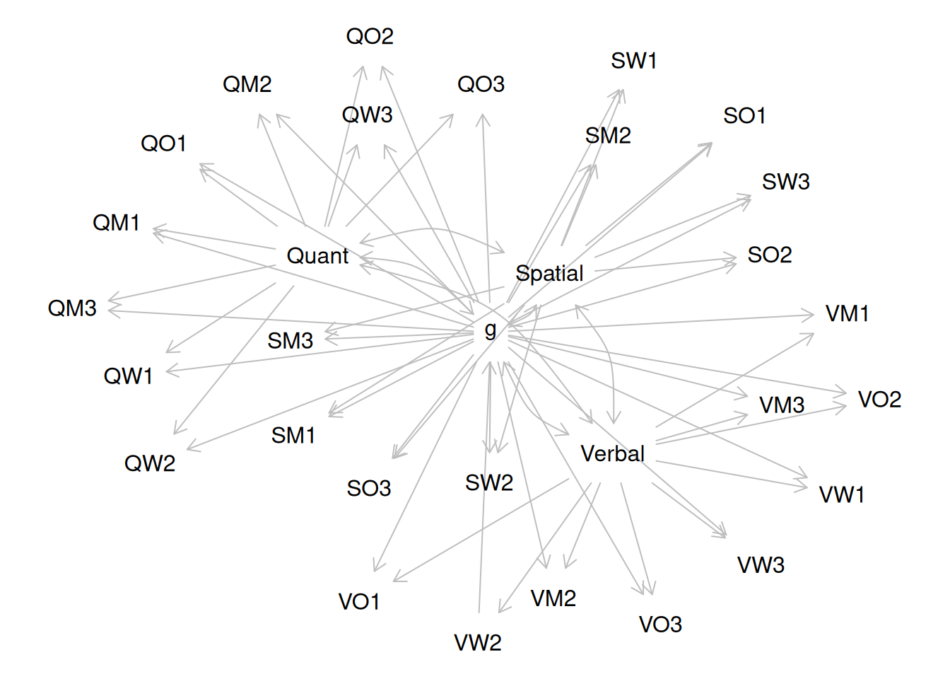 It used to take a long time to calculate a factor analysis because it was computed by hand. Now, it is fast to compute factor analysis with computers (e.g., oftentimes less than 30 ms). In the 1920s, Spearman developed factor analysis to understand the factor structure of intelligence. It was a long process—it took Spearman around one year to calculate the first factor analysis! Factor analysis takes a large dimension data set and simplifies it into a smaller set of factors that are thought to reflect underlying constructs. If you believe that nature is simple underneath, factor analysis gives nature a chance to display the simplicity that lives beneath the complexity on the surface. Spearman identified a single factor, g, that accounted for most of the covariation between the measures of intelligence.