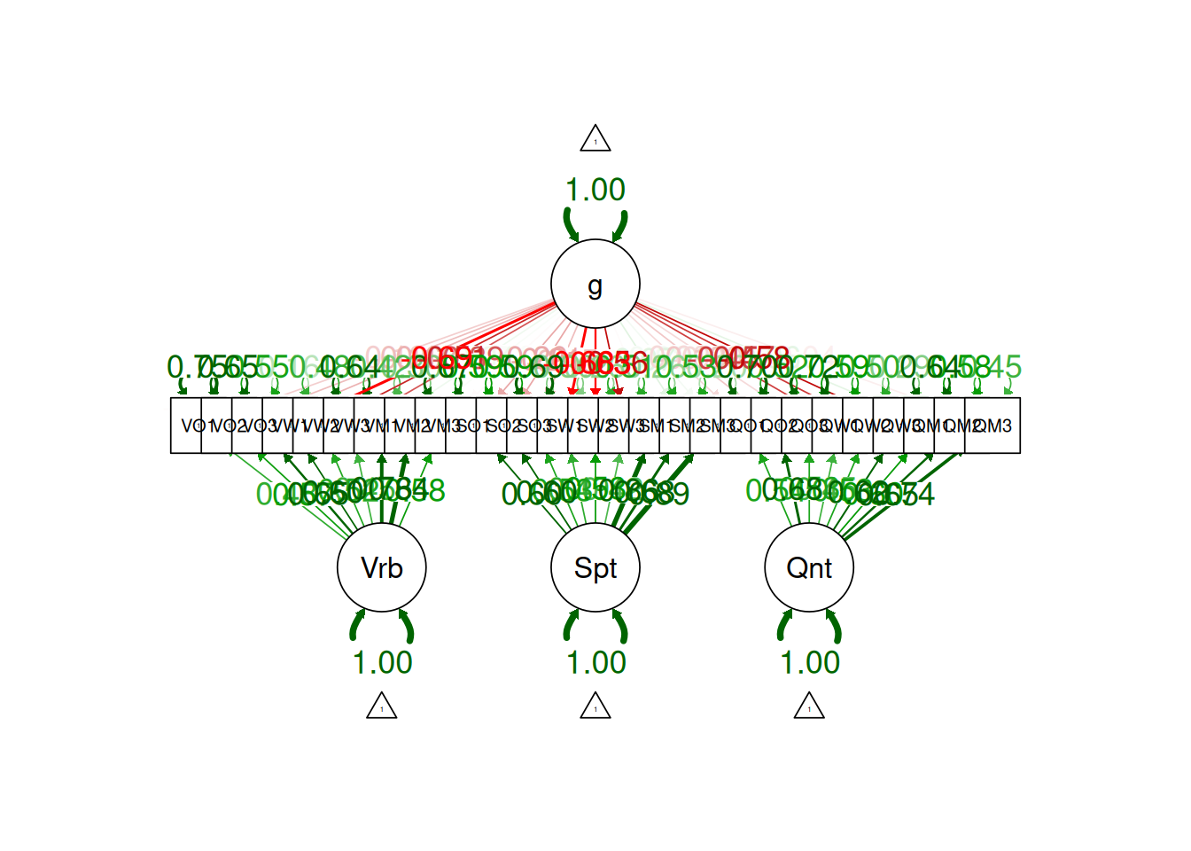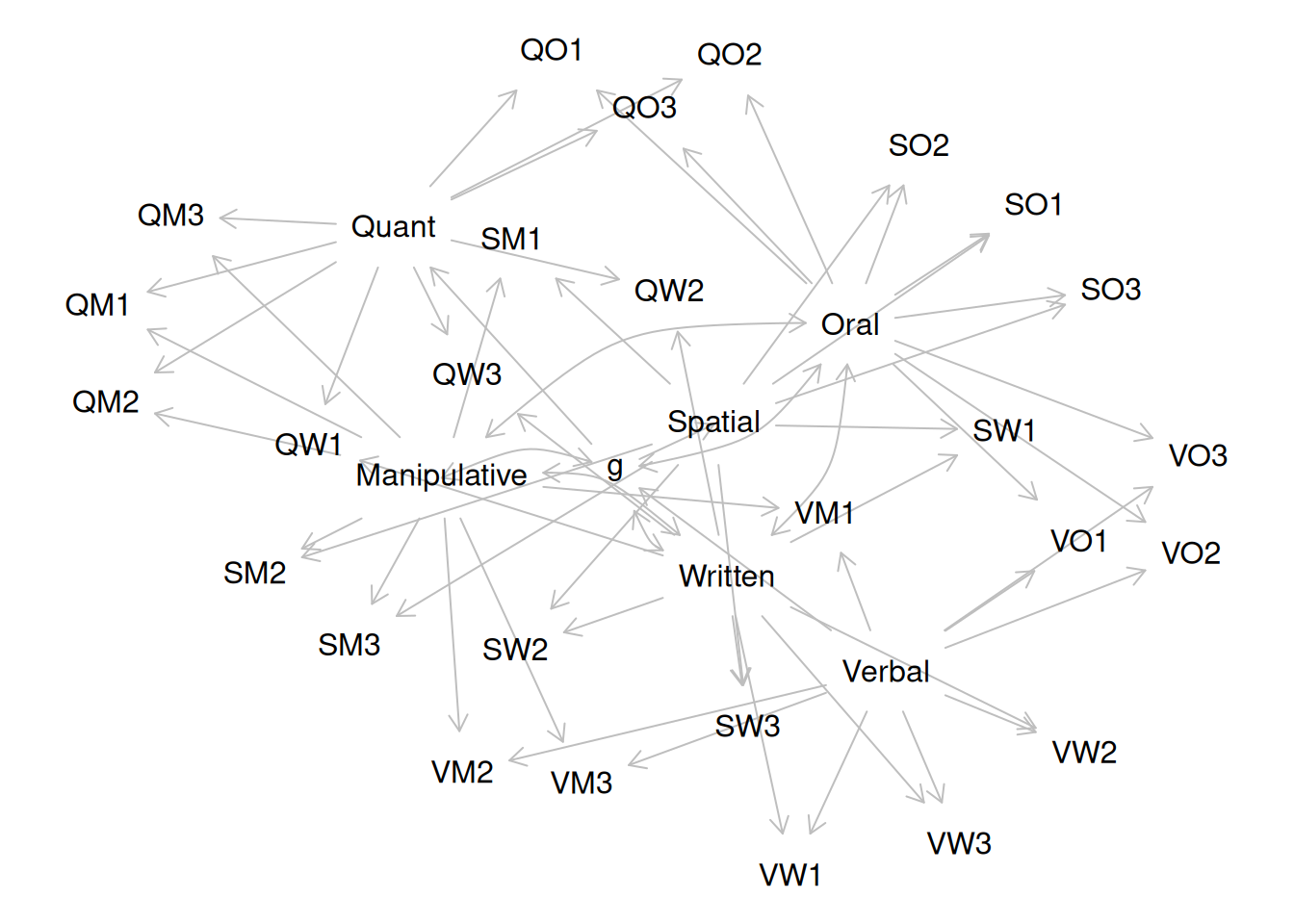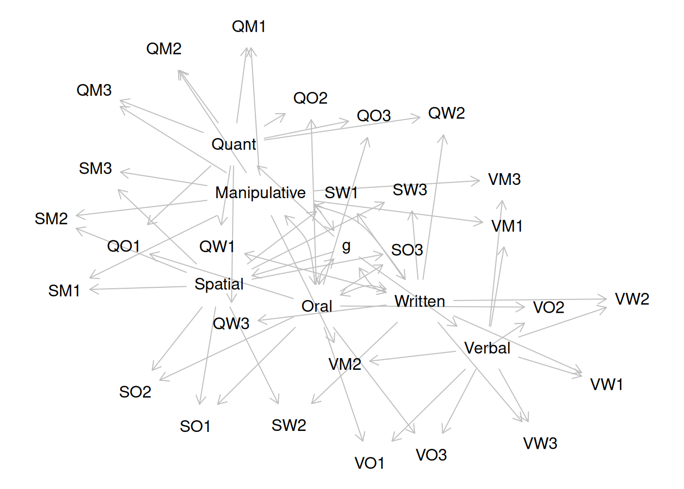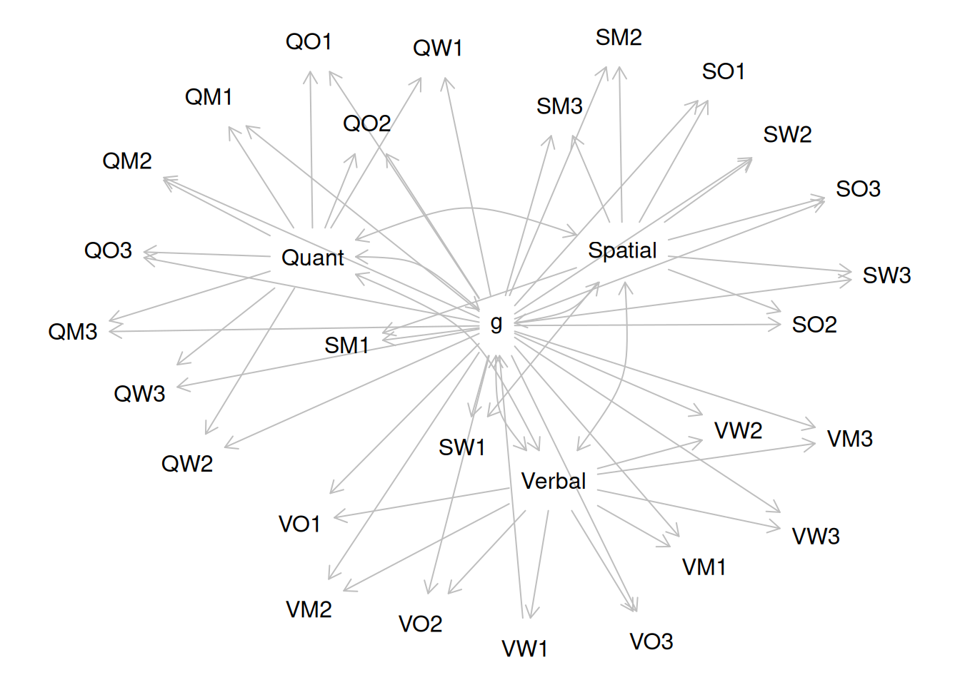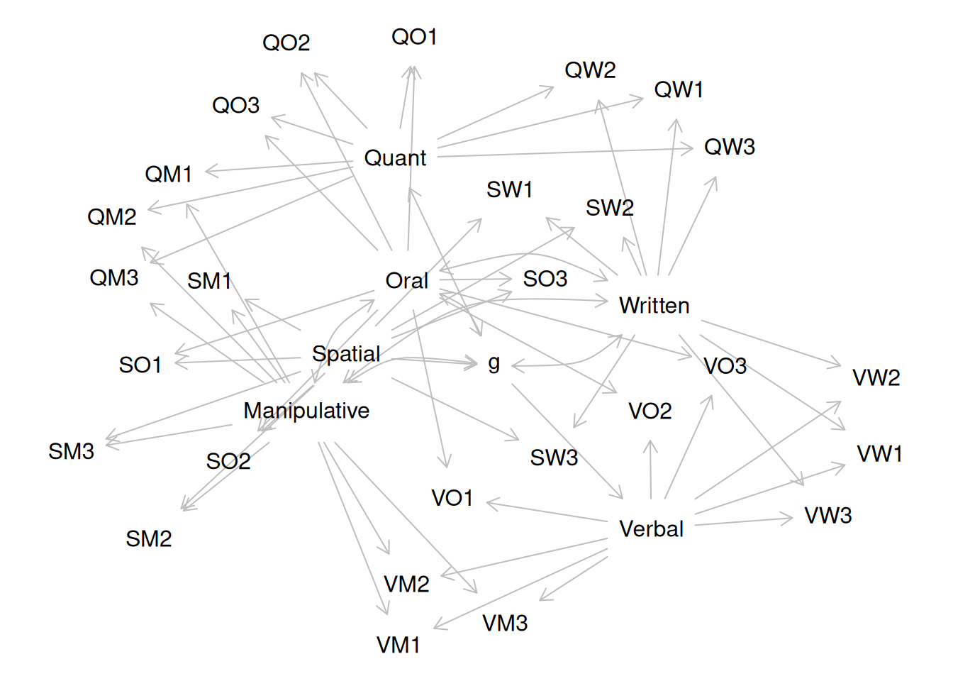 It used to take a long time to calculate a factor analysis because it was computed by hand. Now, it is fast to compute factor analysis with computers (e.g., oftentimes less than 30 ms). In the 1920s, Spearman developed factor analysis to understand the factor structure of intelligence. It was a long process—it took Spearman around one year to calculate the first factor analysis! Factor analysis takes a large dimension data set and simplifies it into a smaller set of factors that are thought to reflect underlying constructs. If you believe that nature is simple underneath, factor analysis gives nature a chance to display the simplicity that lives beneath the complexity on the surface. Spearman identified a single factor, g, that accounted for most of the covariation between the measures of intelligence.