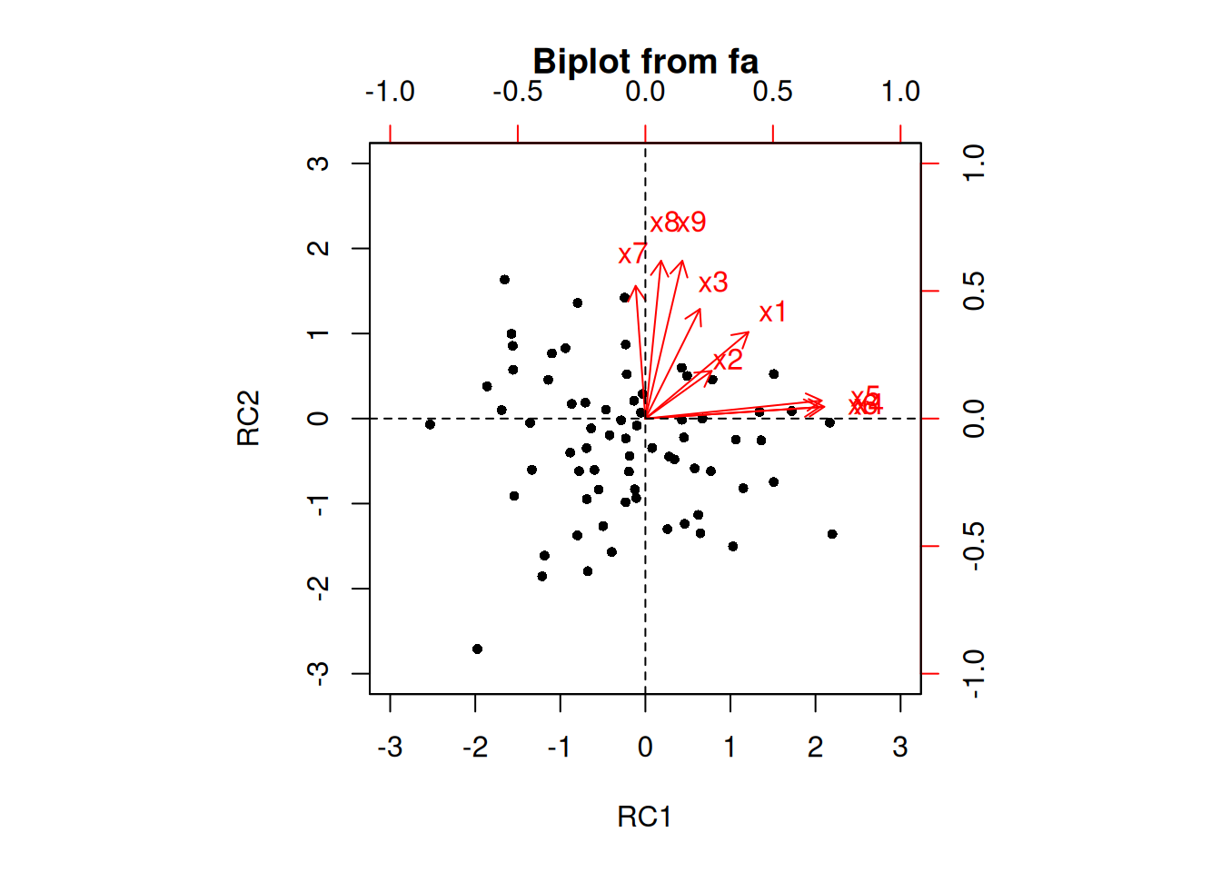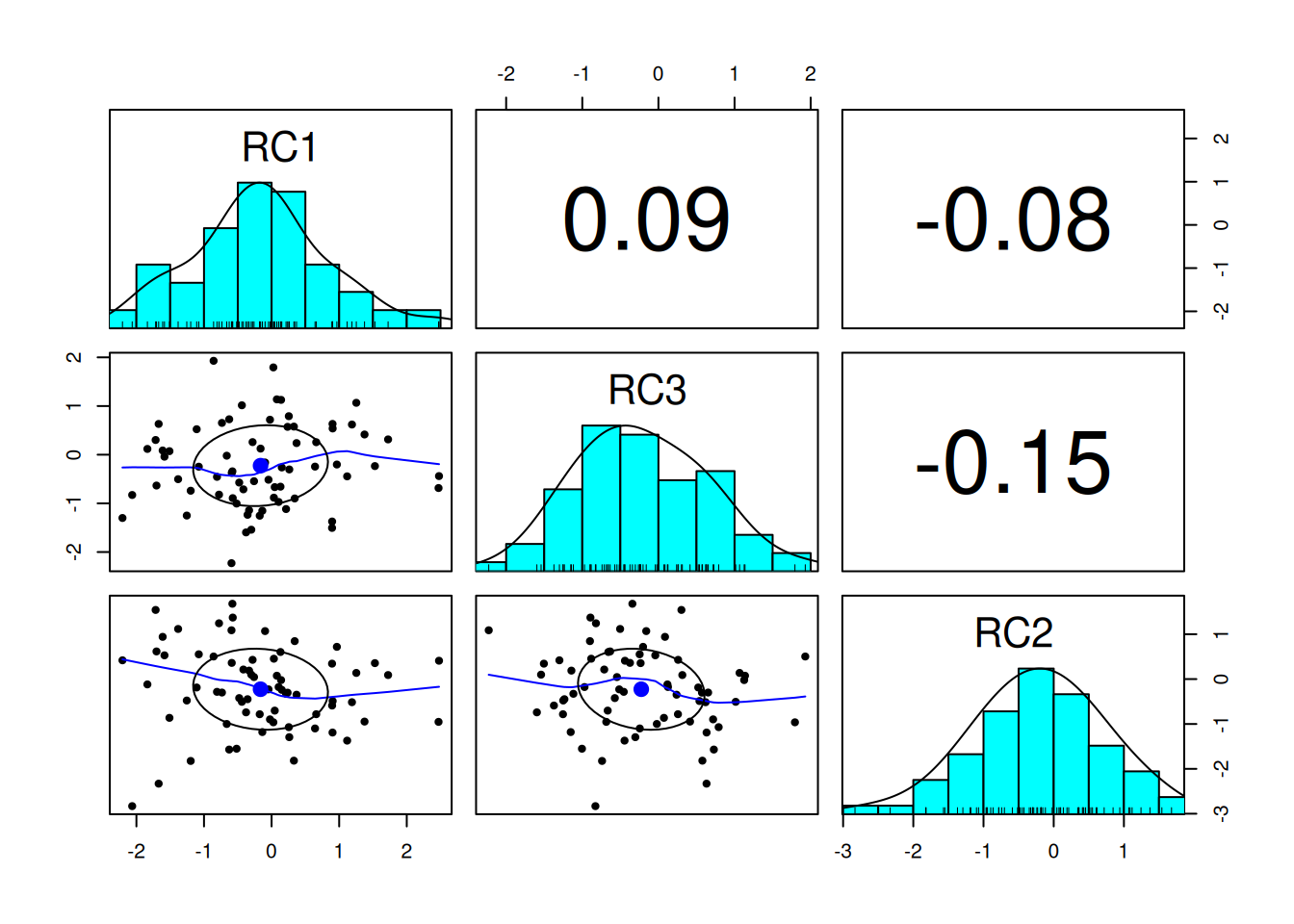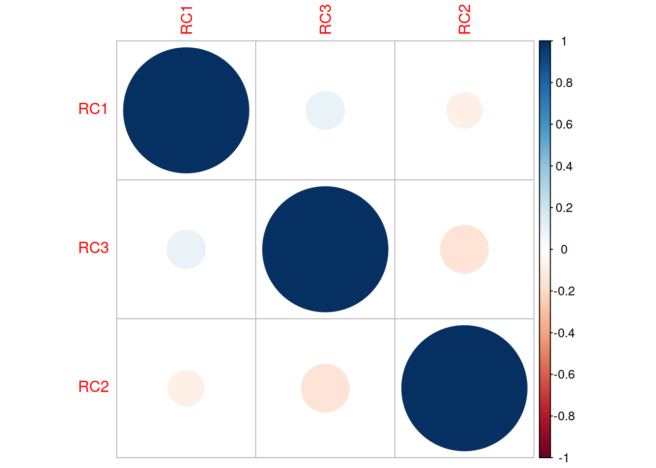 As a result, to improve the interpretability of the factor analysis, we can do what is called rotation. Rotation leverages the idea that there are infinite solutions to the factor analysis model that fit equally well. Rotation involves changing the orientation of the factors by changing the axes so that variables end up with very high (close to one or negative one) or very low (close to zero) loadings, so that it is clear which factors include which variables (and which factors each variable most strongly loads onto). That is, rotation rescales the factors and tries to identify the ideal solution (factor) for each variable. Rotation occurs by changing the variables’ loadings while keeping the structure of correlations among the variables intact (Field et al., 2012). Moreover, rotation does not change the variance explained by factors. Rotation searches for simple structure and keeps searching until it finds a minimum (i.e., the closest as possible to simple structure). After rotation, if the rotation was successful for imposing simple structure, each factor will have loadings close to one (or negative one) for some variables and close to zero for other variables. The goal of factor rotation is to achieve simple structure, to help make it easier to interpret the meaning of the factors.