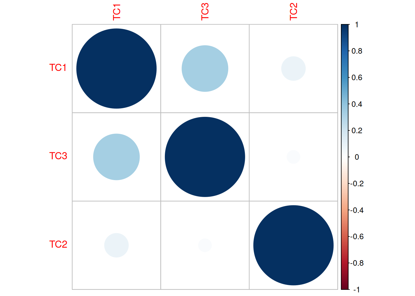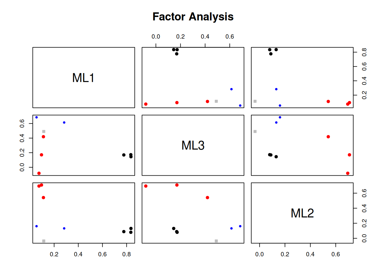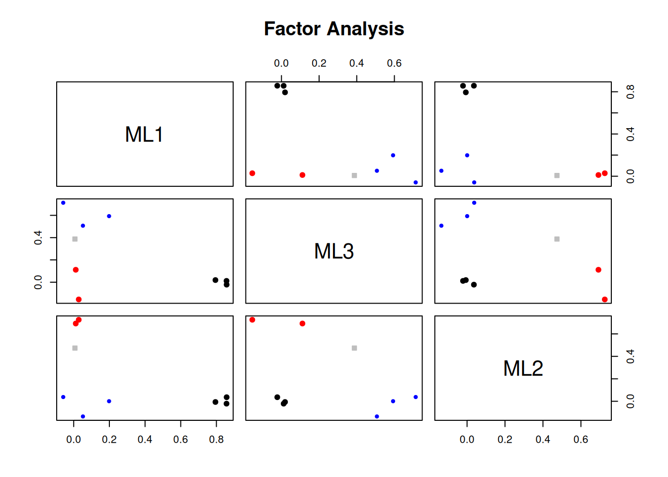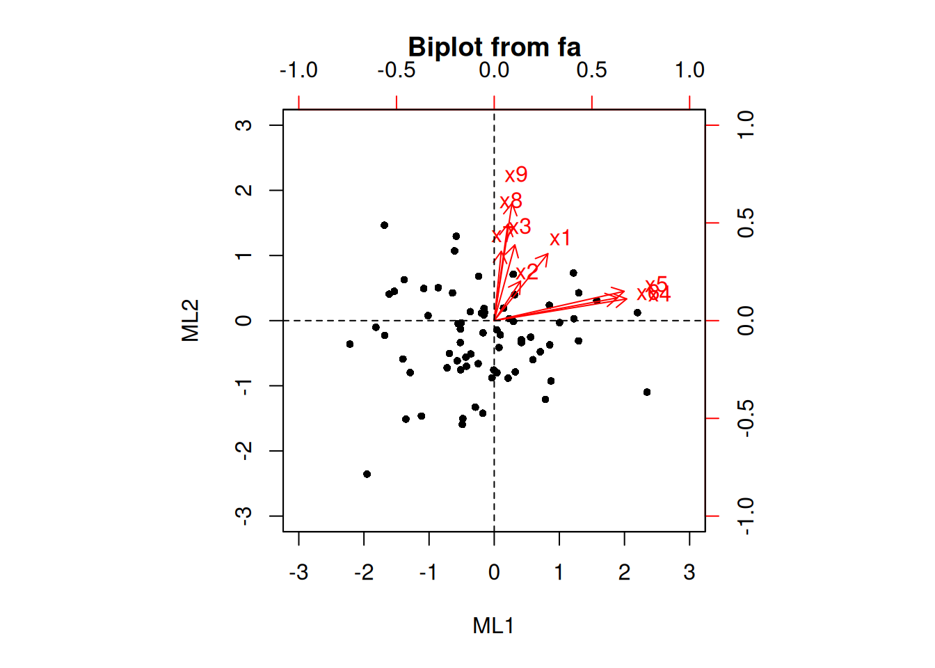 As a result, to improve the interpretability of the factor analysis, we can do what is called rotation. Rotation leverages the idea that there are infinite solutions to the factor analysis model that fit equally well. Rotation involves changing the orientation of the factors by changing the axes so that variables end up with very high (close to one or negative one) or very low (close to zero) loadings, so that it is clear which factors include which variables (and which factors each variable most strongly loads onto). That is, rotation rescales the factors and tries to identify the ideal solution (factor) for each variable. Rotation occurs by changing the variables’ loadings while keeping the structure of correlations among the variables intact (Field et al., 2012). Moreover, rotation does not change the variance explained by factors. Rotation searches for simple structure and keeps searching until it finds a minimum (i.e., the closest as possible to simple structure). After rotation, if the rotation was successful for imposing simple structure, each factor will have loadings close to one (or negative one) for some variables and close to zero for other variables. The goal of factor rotation is to achieve simple structure, to help make it easier to interpret the meaning of the factors.