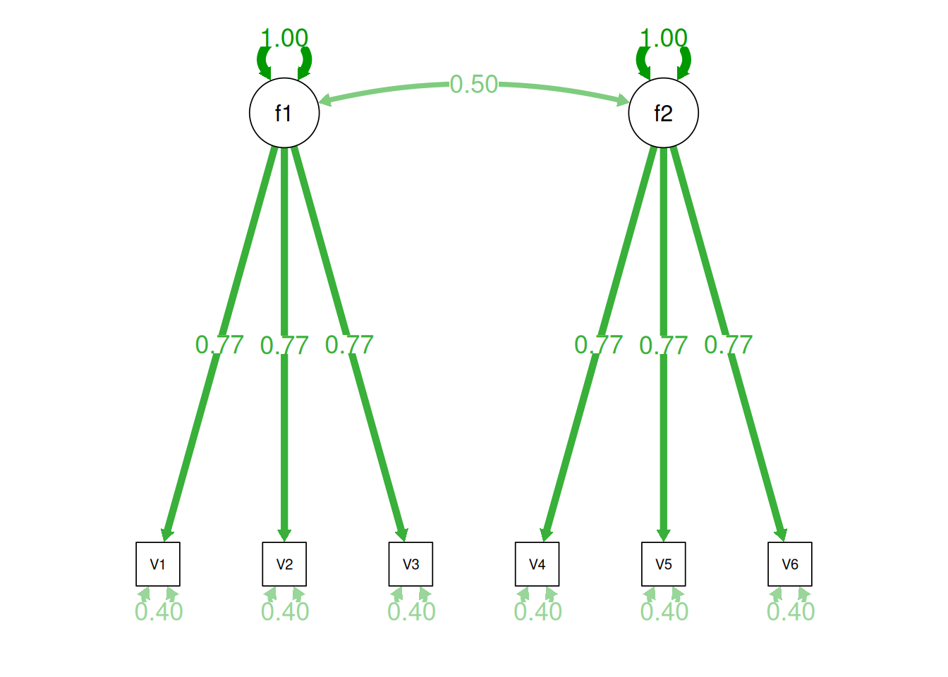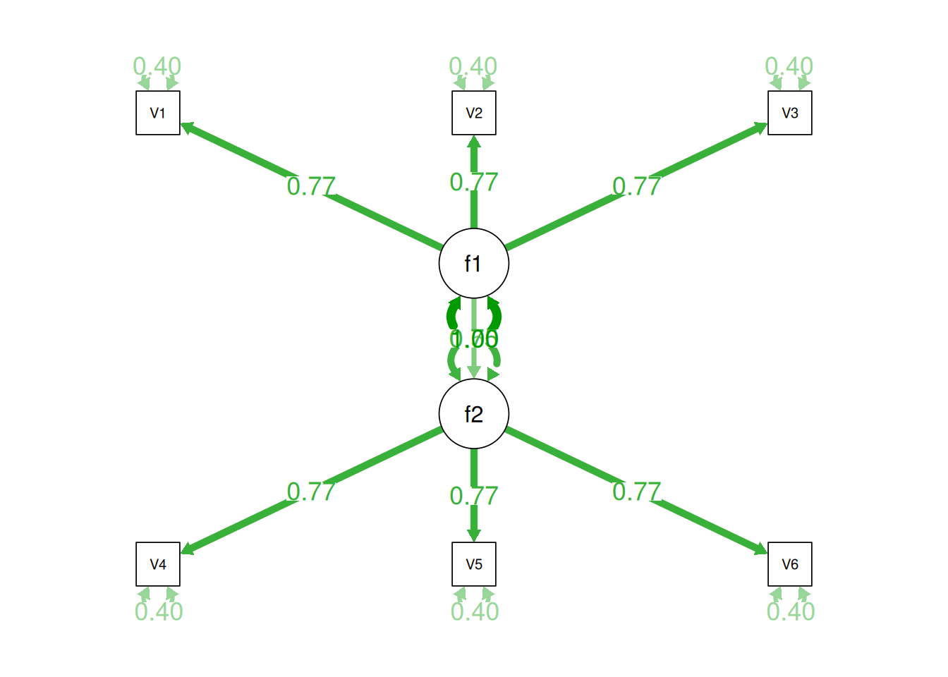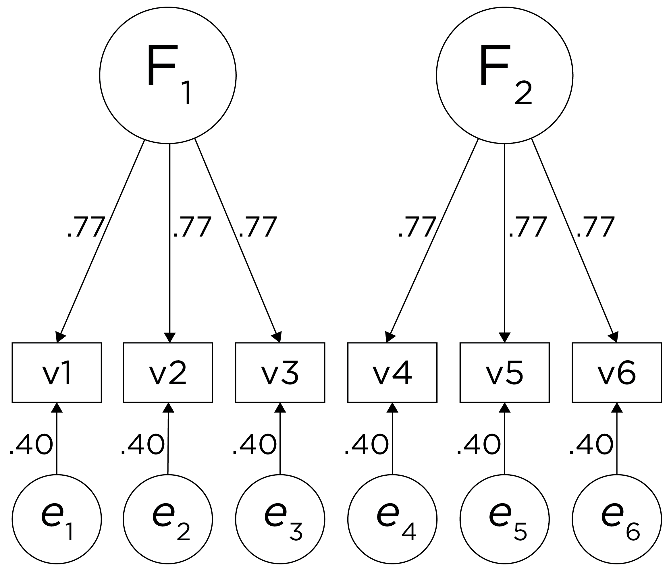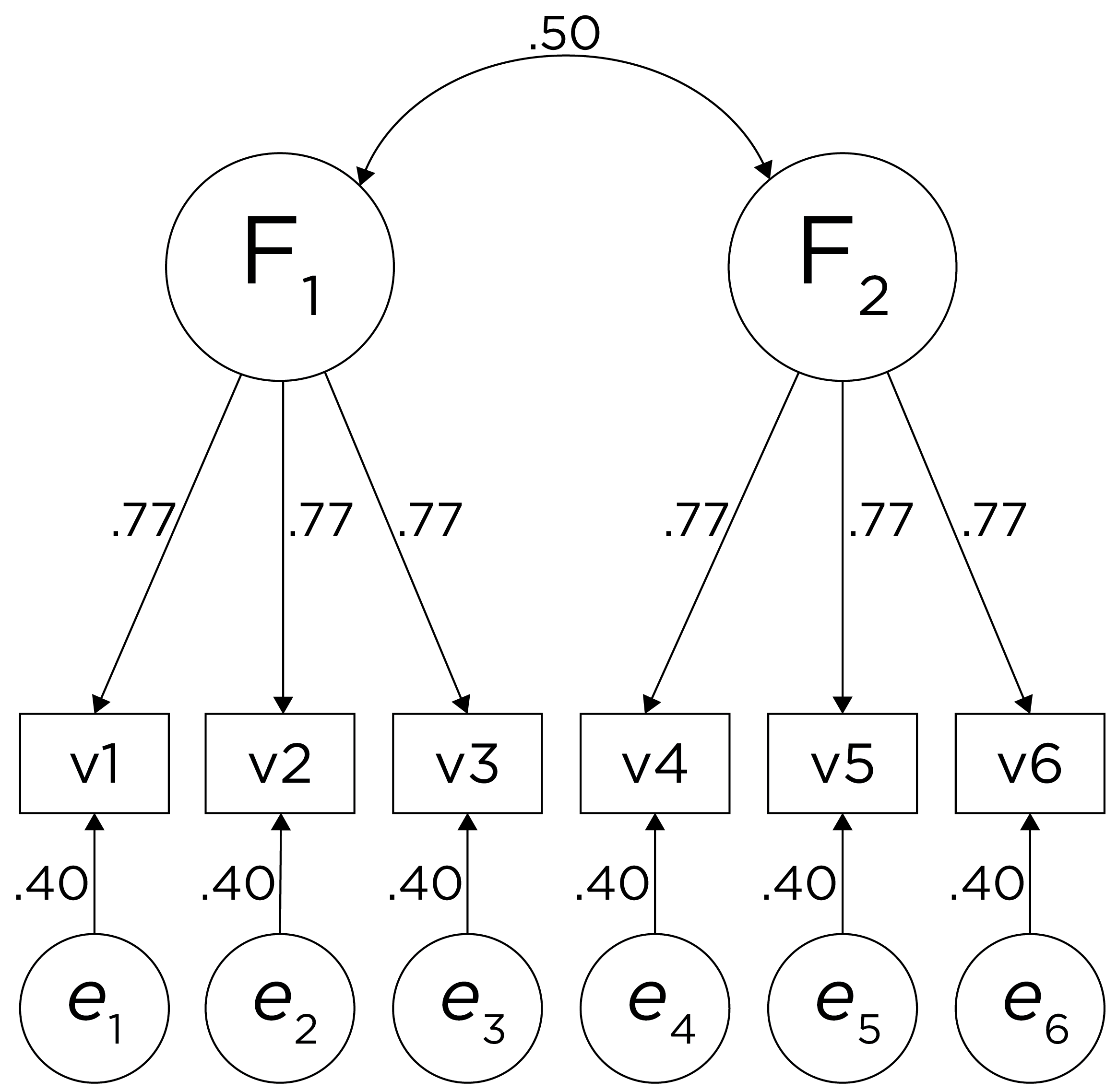 One way to model these data is depicted in Figure 14.8. In this model, the factor loadings are .77, the residual error terms are .40, and there is a covariance path of .50 for the association between Factor 1 and Factor 2. Going from the model to the correlation matrix is deterministic. If you know the model, you can calculate the correlation matrix. For instance, using path tracing rules (described in Section 4.1), the correlation of measures within a factor in this model is calculated as: \(0.60 = .77 \times .77\). Using path tracing rules, the correlation of measures across factors in this model is calculated as: \(.30 = .77 \times .50 \times .77\). In this model, each latent factor accounts for 60% of the variance in the indicators that load onto it: \(\frac{.77^2 + .77^2 + .77^2}{3} = \frac{.60 + .60 + .60}{3} = .60\). Each latent factor accounts for 37% of the variance in all of the indicators: \(\frac{.77^2 + .77^2 + .77^2 + (.50^2 \times .77^2) + (.50^2 \times .77^2) + (.50^2 \times .77^2)}{6} = \frac{.60 + .60 + .60 + .15 + .15 + .15}{6} = .37\).