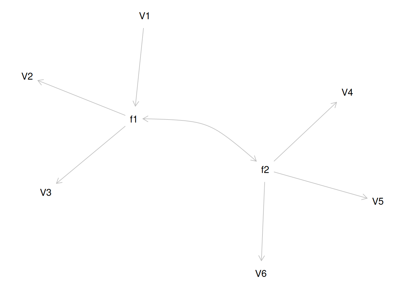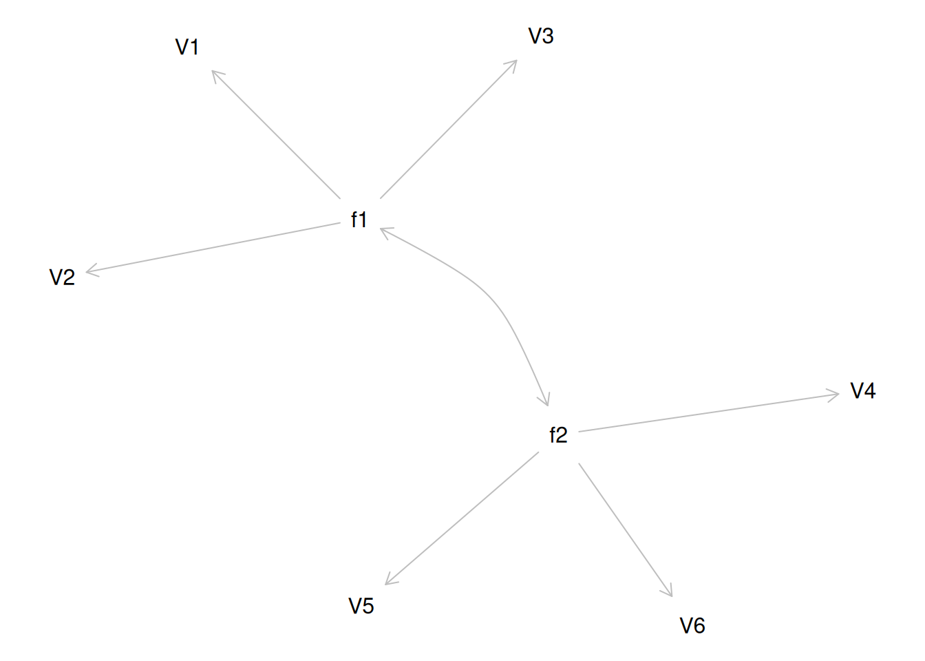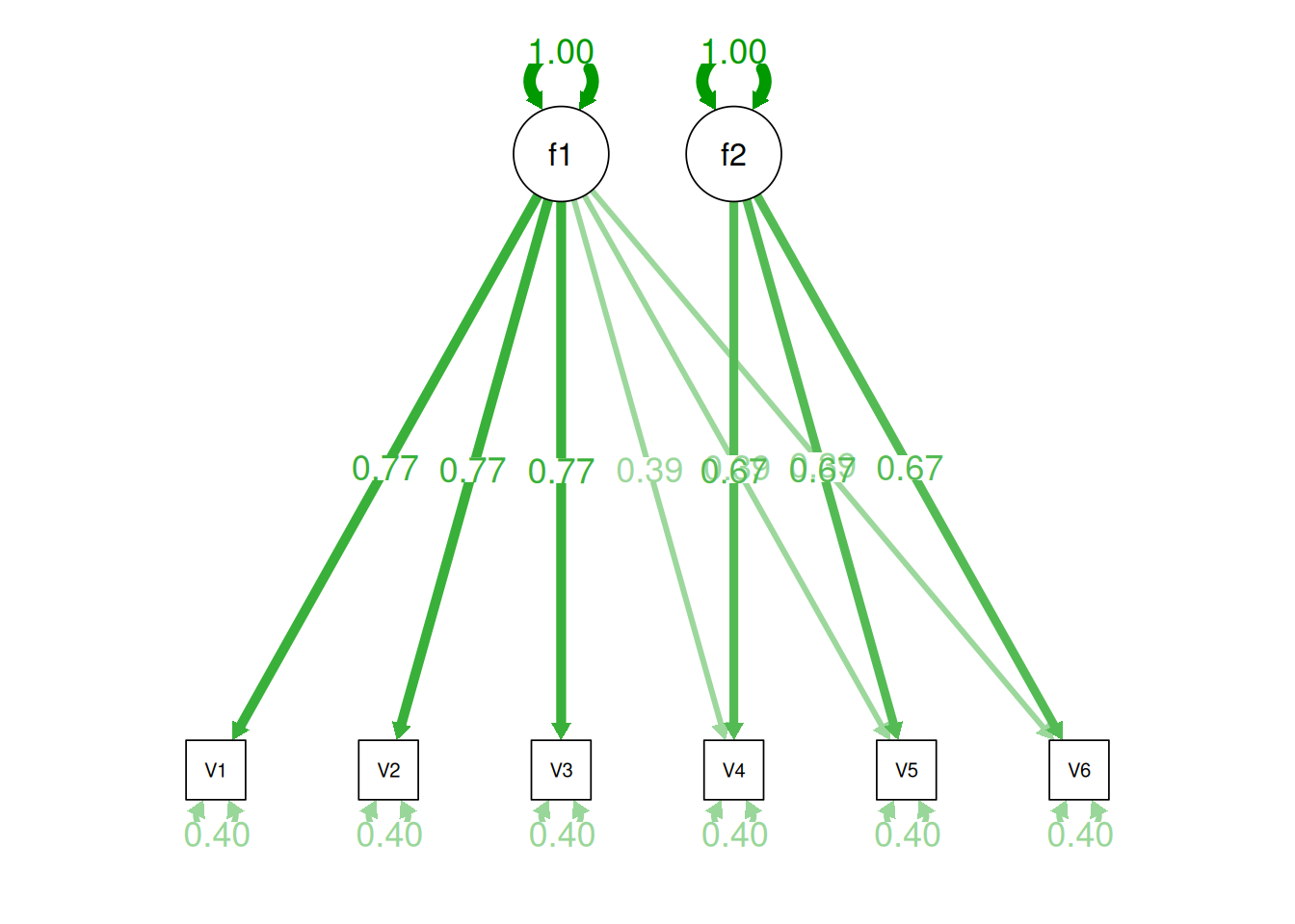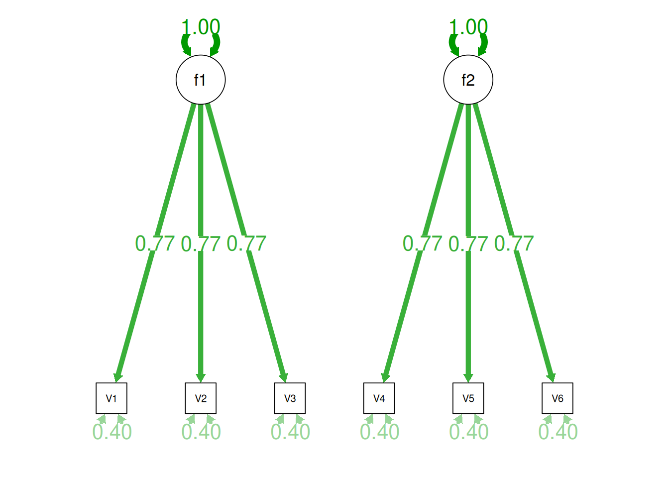 One way to model these data is depicted in Figure 14.8. In this model, the factor loadings are .77, the residual error terms are .40, and there is a covariance path of .50 for the association between Factor 1 and Factor 2. Going from the model to the correlation matrix is deterministic. If you know the model, you can calculate the correlation matrix. For instance, using path tracing rules (described in Section 4.1), the correlation of measures within a factor in this model is calculated as: \(0.60 = .77 \times .77\). Using path tracing rules, the correlation of measures across factors in this model is calculated as: \(.30 = .77 \times .50 \times .77\). In this model, each latent factor accounts for 60% of the variance in the indicators that load onto it: \(\frac{.77^2 + .77^2 + .77^2}{3} = \frac{.60 + .60 + .60}{3} = .60\). Each latent factor accounts for 37% of the variance in all of the indicators: \(\frac{.77^2 + .77^2 + .77^2 + (.50^2 \times .77^2) + (.50^2 \times .77^2) + (.50^2 \times .77^2)}{6} = \frac{.60 + .60 + .60 + .15 + .15 + .15}{6} = .37\).