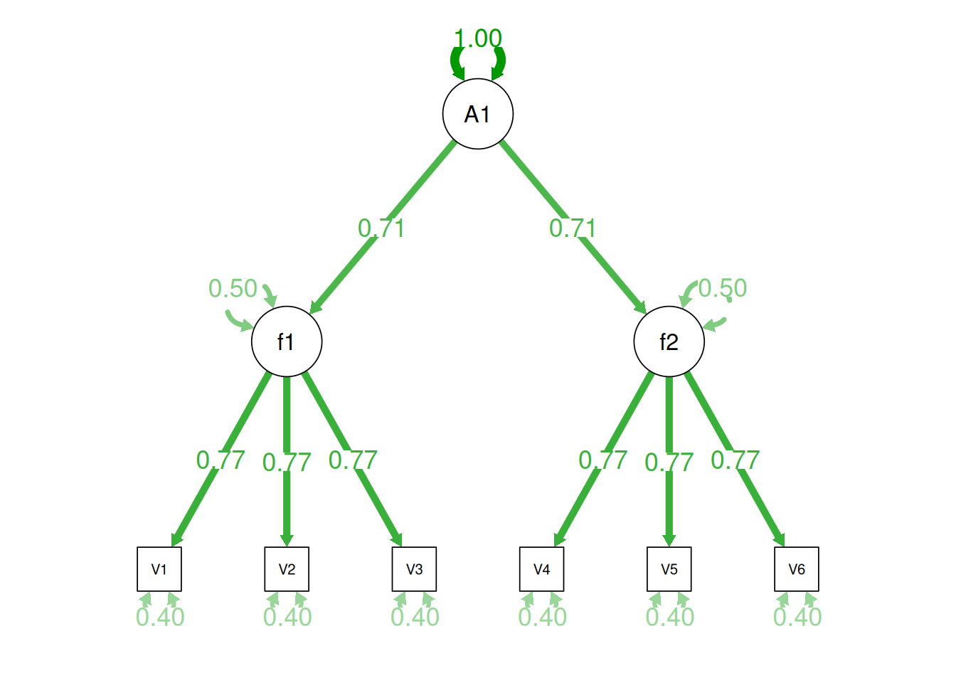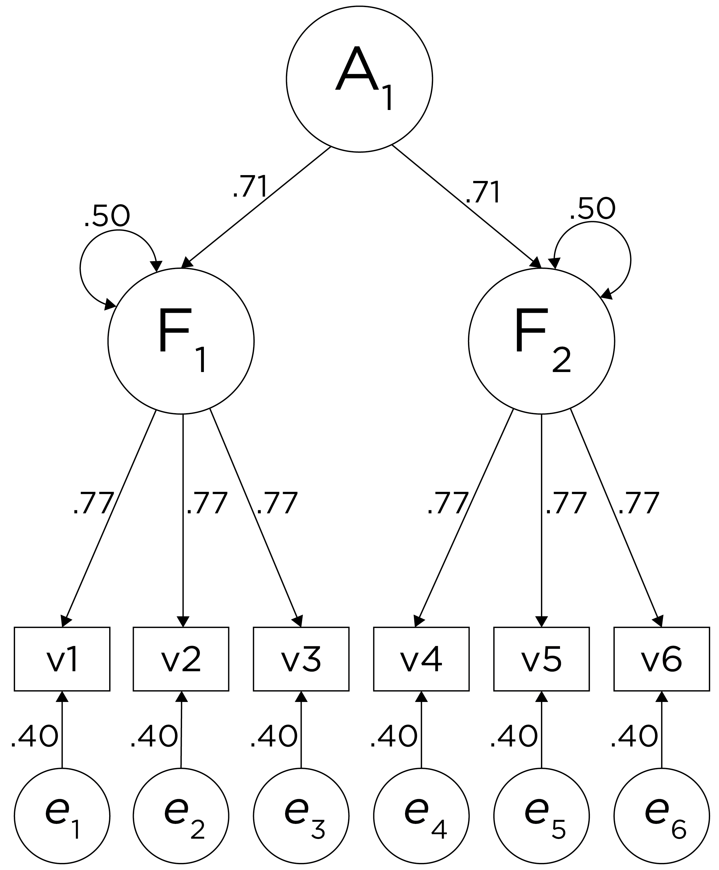 Alternatively, something else (e.g., another factor) could be explaining the data that we have not considered, as depicted in Figure 14.10). This is a higher-order factor model, in which there is a higher-order factor (\(A_1\)) that influences both lower-order factors, Factor 1 (\(F_1\)) and Factor 2 (\(F_2\)). The factor loadings from the lower order factors to the manifest variables are .77, the factor loading from the higher-order factor to the lower-order factors is .71, and the residual error terms are .40. This model has the exact same fit as the previous models. The proportion of variance in a lower-order factor (\(F_1\) or \(F_2\)) that is explained by the higher-order factor (\(A_1\)) is calculated as: \(.50 = .71 \times .71\). The disturbance term is calculated as \(.50 = 1 - (.71 \times .71) = 1 - .50\). Using path tracing rules, the correlation of measures across factors in this model is calculated as: \(.30 = .77 \times .71 \times .71 \times .77\). In this model, the higher-order factor (\(A_1\)) accounts for 30% of the variance in the indicators: \(\frac{(.77^2 \times .71^2) + (.77^2 \times .71^2) + (.77^2 \times .71^2) + (.77^2 \times .71^2) + (.77^2 \times .71^2) + (.77^2 \times .71^2)}{6} = \frac{.30 + .30 + .30 + .30 + .30 + .30}{6} = .30\).