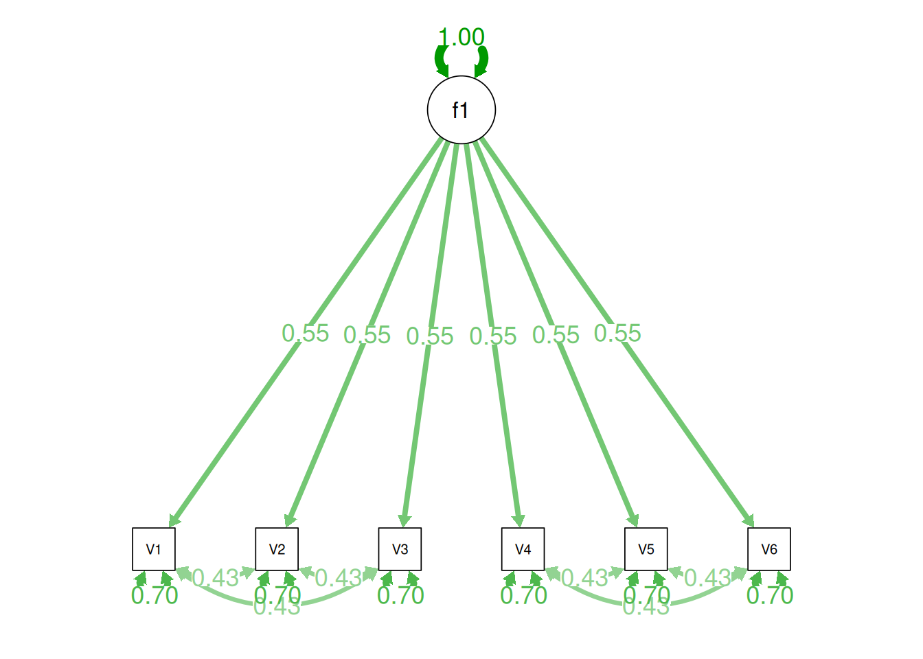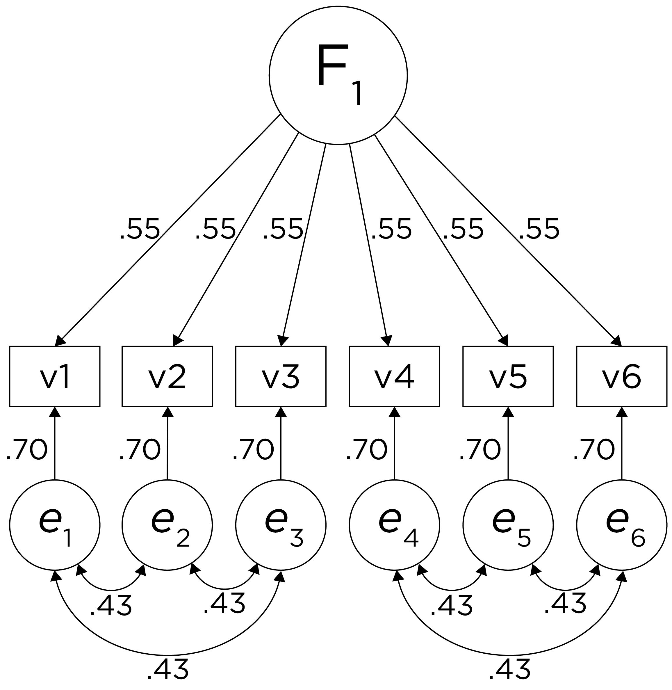 Alternatively, there could be a single factor that ties measures 1, 2, and 3 together and measures 4, 5, and 6 together, as depicted in Figure 14.11. In this model, the measures no longer have merely random error: measures 1, 2, and 3 have correlated residuals—that is, they share error variance (i.e., systematic error); likewise, measures 4, 5, and 6 have correlated residuals. This model has the exact same fit as the previous models. The amount of common variance (\(R^2\)) that is accounted for by an indicator is estimated as the square of the standardized loading: \(.30 = .55 \times .55\). The amount of error for an indicator is estimated as: \(\text{error} = 1 - \text{common variance}\), so in this case, the amount of error is: \(.70 = 1 - .30\). Using path tracing rules, the correlation of measures within a factor in this model is calculated as: \(.60 = (.55 \times .55) + (.70 \times .43 \times .70) + (.70 \times .43 \times .43 \times .70)\). The correlation of measures across factors in this model is calculated as: \(.30 = .55 \times .55\). In this model, the latent factor accounts for 30% of the variance in the indicators: \(\frac{.55^2 + .55^2 + .55^2 + .55^2 + .55^2 + .55^2}{6} = \frac{.30 + .30 + .30 + .30 + .30 + .30}{6} = .30\).