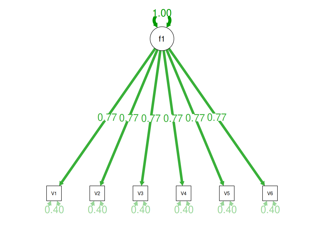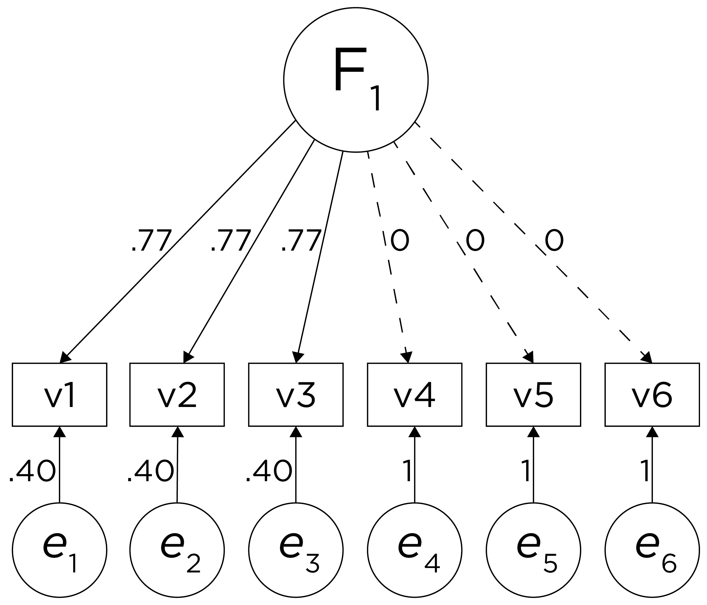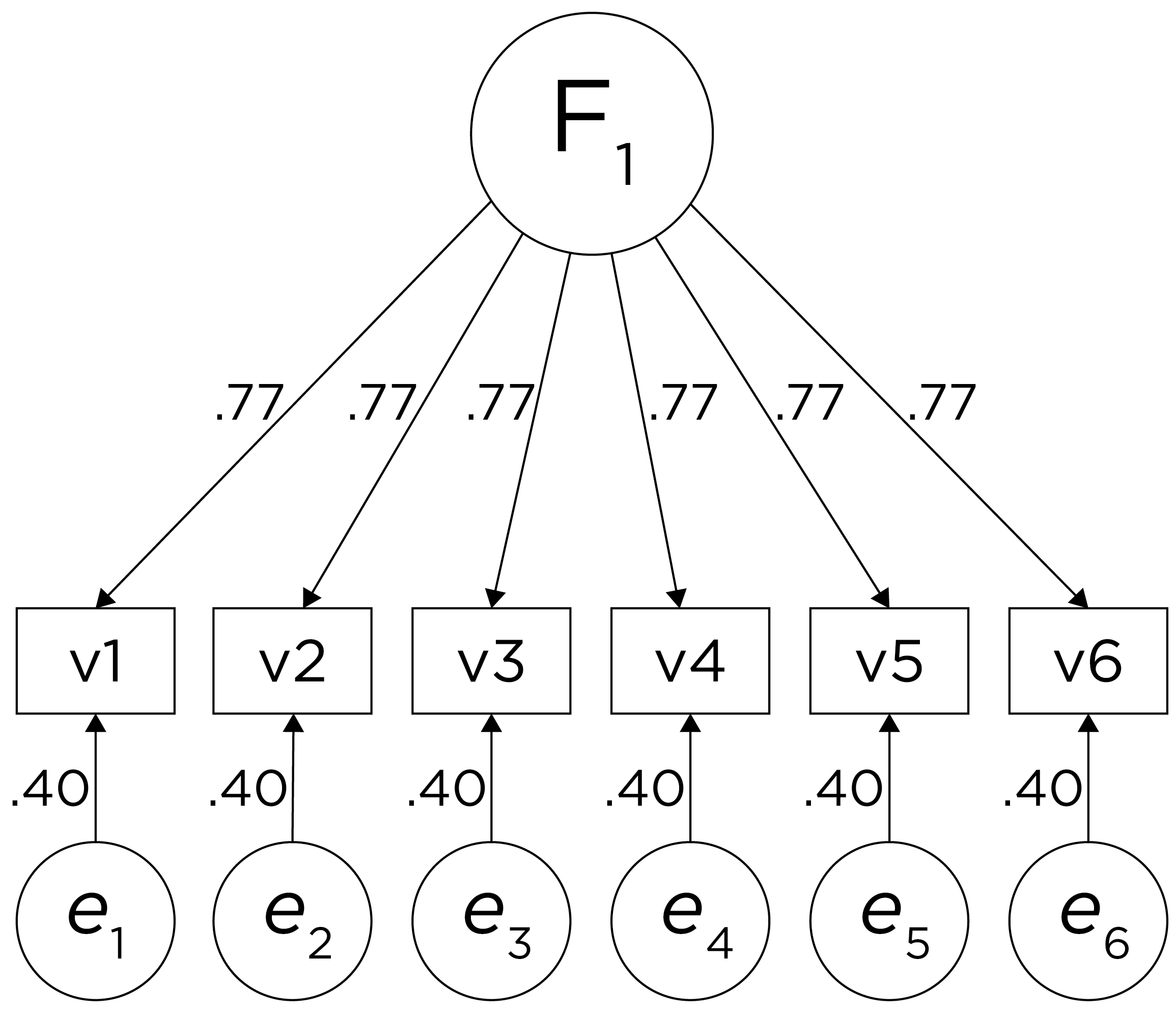 In a single-factor model fit to these data, the factor loadings are .77 and the residual error terms are .40, as depicted in Figure 14.2. The amount of common variance (\(R^2\)) that is accounted for by an indicator is estimated as the square of the standardized loading: \(.60 = .77 \times .77\). The amount of error for an indicator is estimated as: \(\text{error} = 1 - \text{common variance}\), so in this case, the amount of error is: \(.40 = 1 - .60\). The proportion of the total variance in indicators that is accounted for by the latent factor is the sum of the square of the standardized loadings divided by the number of indicators. That is, to calculate the proportion of the total variance in the variables that is accounted for by the latent factor, you would square the loadings, sum them up, and divide by the number of variables: \(\frac{.77^2 + .77^2 + .77^2 + .77^2 + .77^2 + .77^2}{6} = \frac{.60 + .60 + .60 + .60 + .60 + .60}{6} = .60\). Thus, the latent factor accounts for 60% of the variance in the indicators. In this model, the latent factor explains the covariance among the variables. If the answer is simple, a small and parsimonious model should be able to obtain the answer.