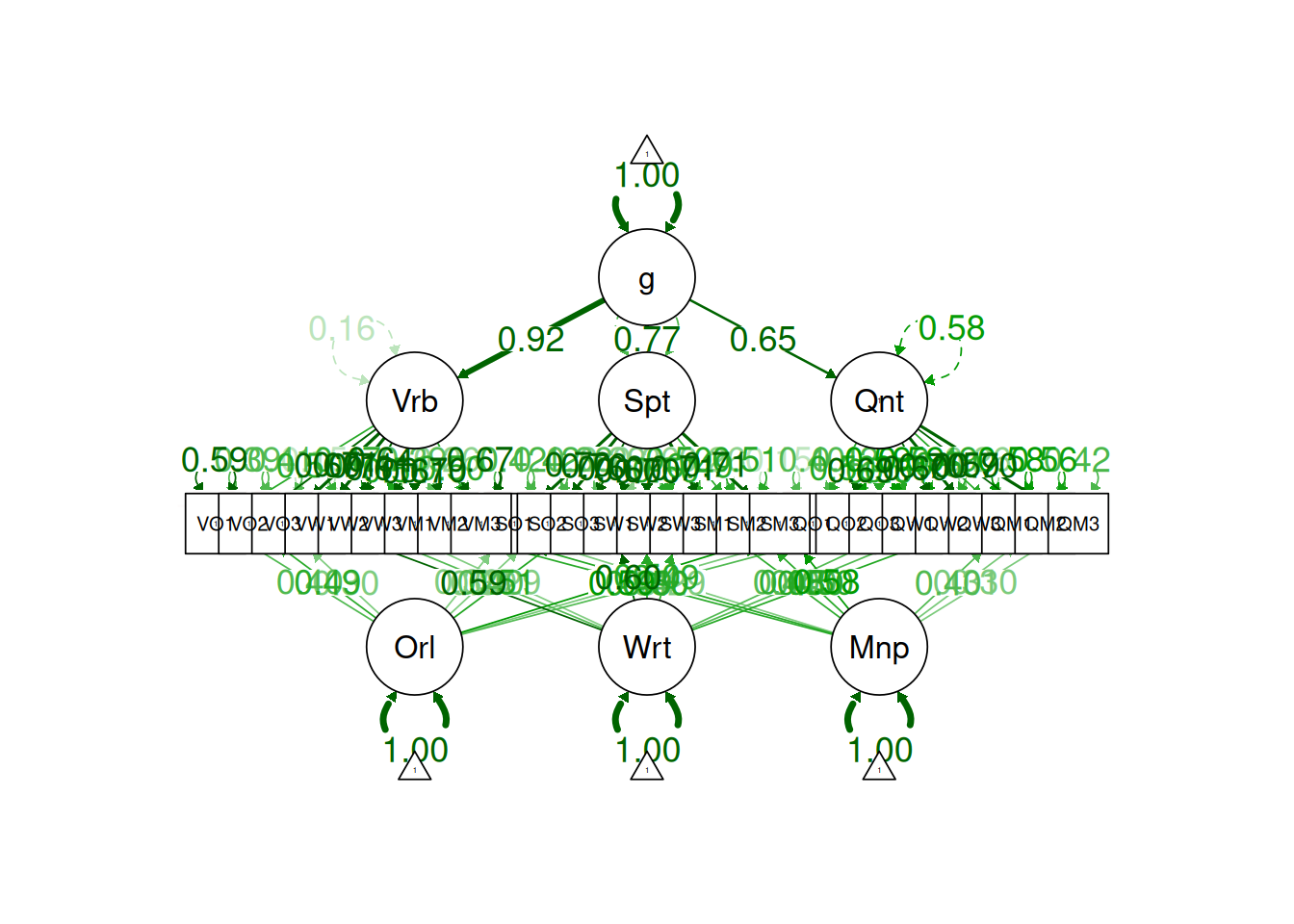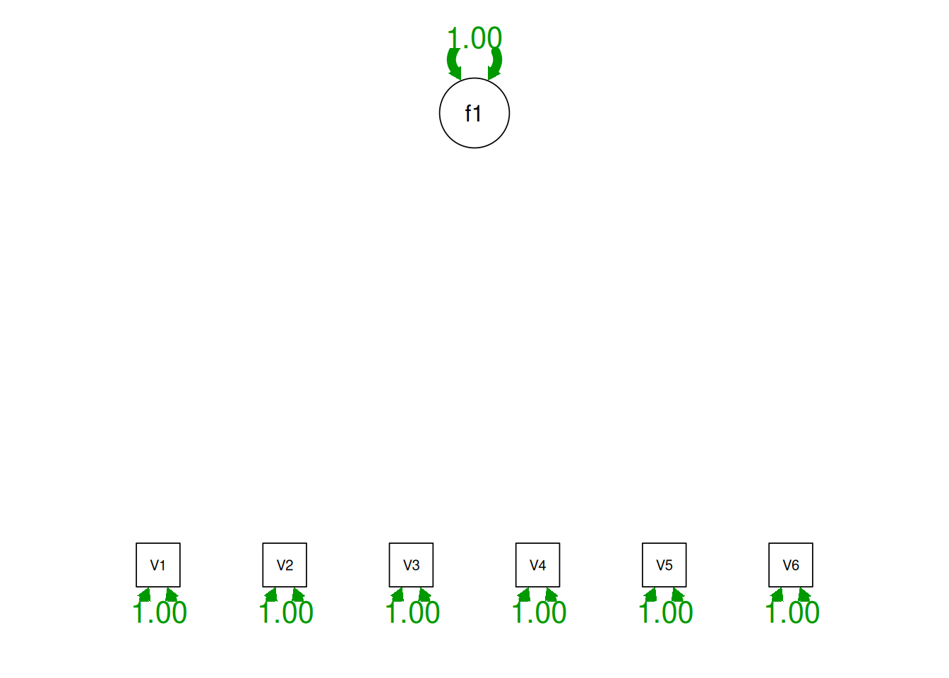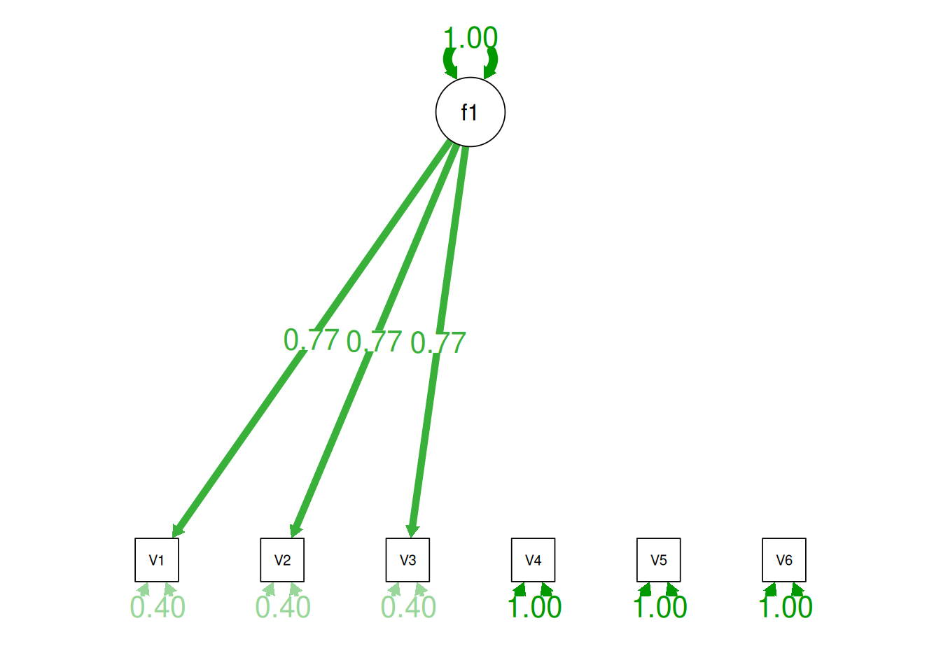 In a single-factor model fit to these data, the factor loadings are .77 and the residual error terms are .40, as depicted in Figure 14.2. The amount of common variance (\(R^2\)) that is accounted for by an indicator is estimated as the square of the standardized loading: \(.60 = .77 \times .77\). The amount of error for an indicator is estimated as: \(\text{error} = 1 - \text{common variance}\), so in this case, the amount of error is: \(.40 = 1 - .60\). The proportion of the total variance in indicators that is accounted for by the latent factor is the sum of the square of the standardized loadings divided by the number of indicators. That is, to calculate the proportion of the total variance in the variables that is accounted for by the latent factor, you would square the loadings, sum them up, and divide by the number of variables: \(\frac{.77^2 + .77^2 + .77^2 + .77^2 + .77^2 + .77^2}{6} = \frac{.60 + .60 + .60 + .60 + .60 + .60}{6} = .60\). Thus, the latent factor accounts for 60% of the variance in the indicators. In this model, the latent factor explains the covariance among the variables. If the answer is simple, a small and parsimonious model should be able to obtain the answer.