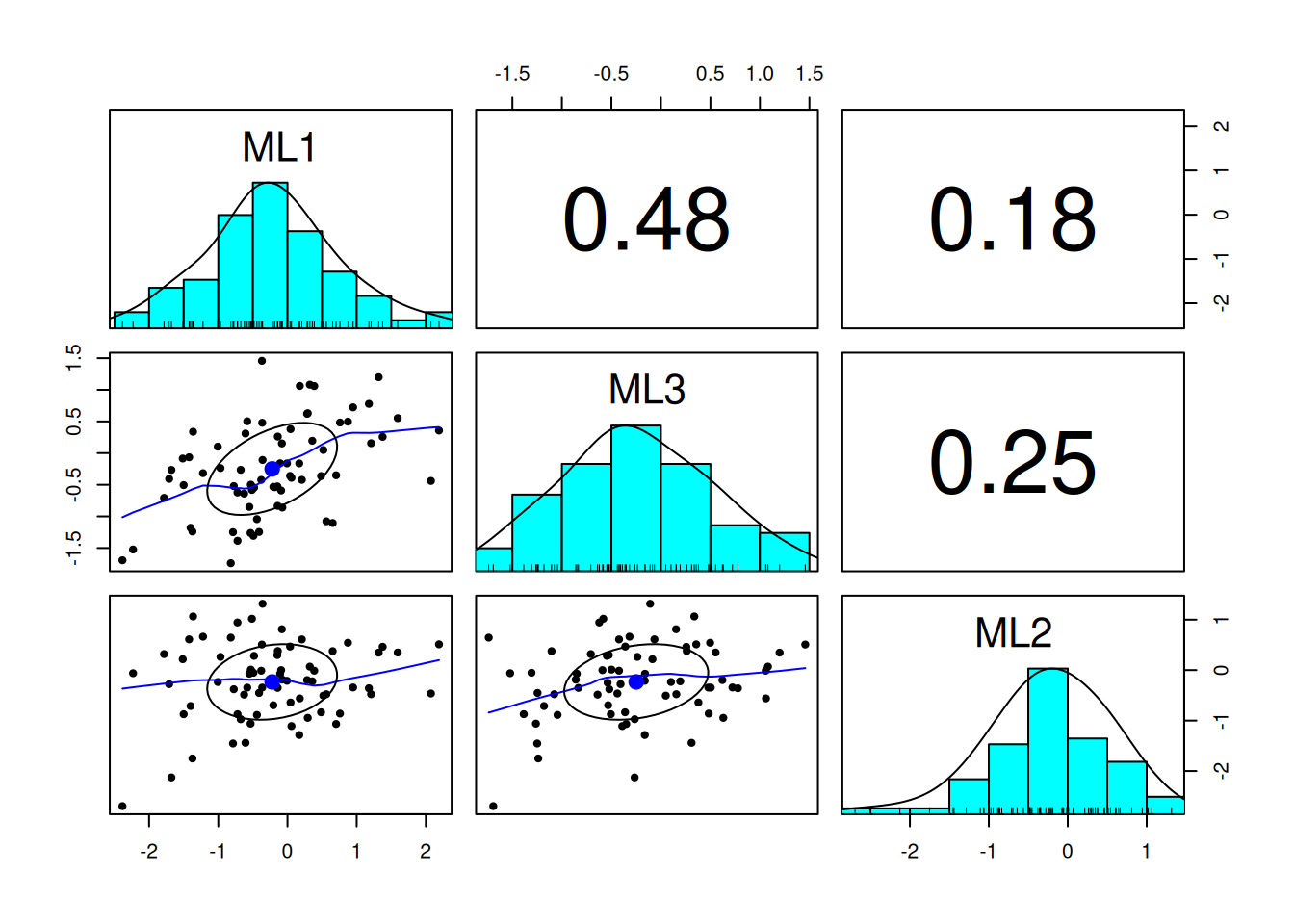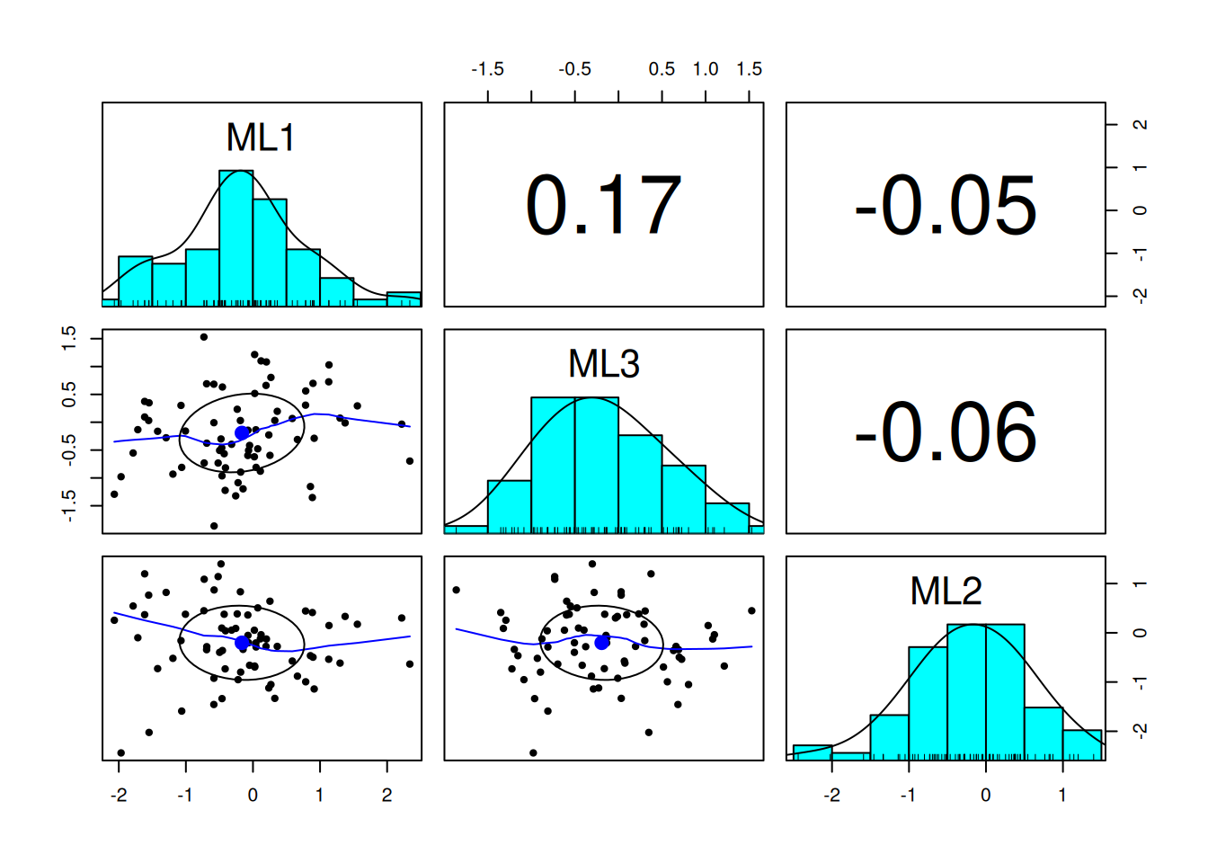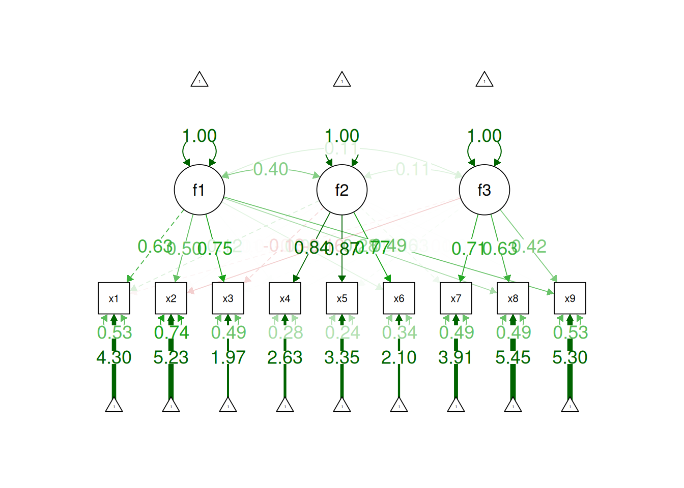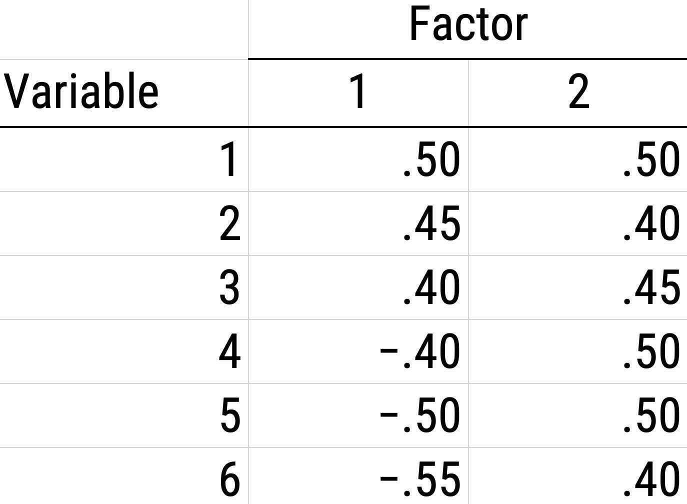 This is why we do not calculate our own factor analysis by hand; use a stats program! It is important to think about the possibility of other models to determine how confident you can be in your data model. For every fully specified factor model—i.e., where the relevant paths are all defined, there is one and only one predictive data matrix (correlation matrix). However, each data matrix can produce many different factor models. Equivalent models are different models with the same degrees of freedom that have the same fit to the data—i.e., they generate the same model-implied covariance matrix and have the same fit indices. Rules for generating equivalent models are provided by Lee & Hershberger (1990). There is no way to distinguish which of these factor models is correct from the data matrix alone. Any given data matrix can predict an infinite number of factor models that accurately represent the data structure (Raykov & Marcoulides, 2001)—so we make decisions that determine what type of factor solution our data will yield. In general, factor indeterminacy—and the uncertainty it creates—tends to be greater in models with fewer items and where those items have smaller factor loadings and larger residual variances (Rigdon et al., 2019a). Conversely, factor indeterminacy is lower when there are many items per latent factor, and when loadings and factor correlations are strong (Rigdon et al., 2019b). Further, factor indeterminacy is compounded when creating factor scores for use in separate analyses [rather than estimating the associations within the same model; Rigdon et al. (2019a)]. Thus, where possible, it is preferable to estimate associations between factors and other variables within the same model.