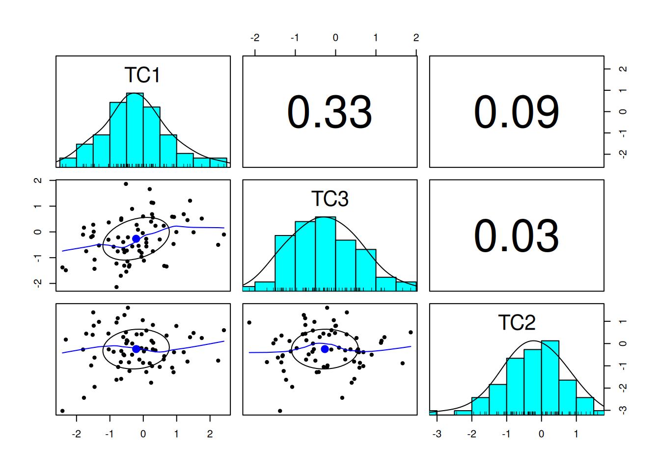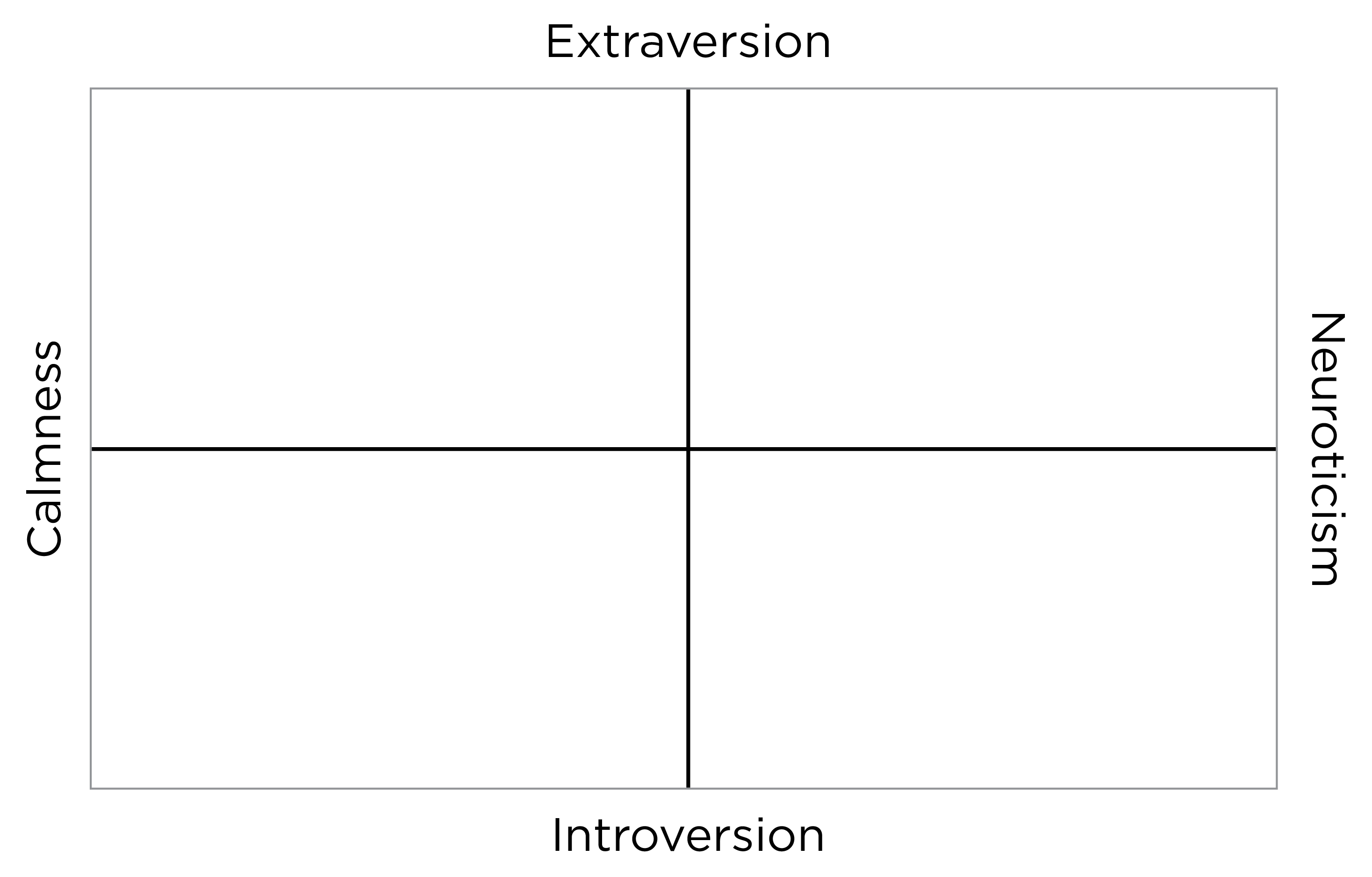 As an example of rotation based on interpretability, consider the Five-Factor Model of Personality (the Big Five), which goes by the acronym, OCEAN: Openness, Conscientiousness, Extraversion, Agreeableness, and Neuroticism. Although the five factors of personality are somewhat correlated, we can use rotation to ensure they are maximally independent. Upon rotation, extraversion and neuroticism are essentially uncorrelated, as depicted in Figure 14.25. The other pole of extraversion is intraversion and the other pole of neuroticism might be emotional stability or calmness.