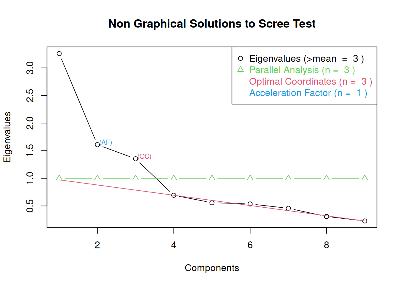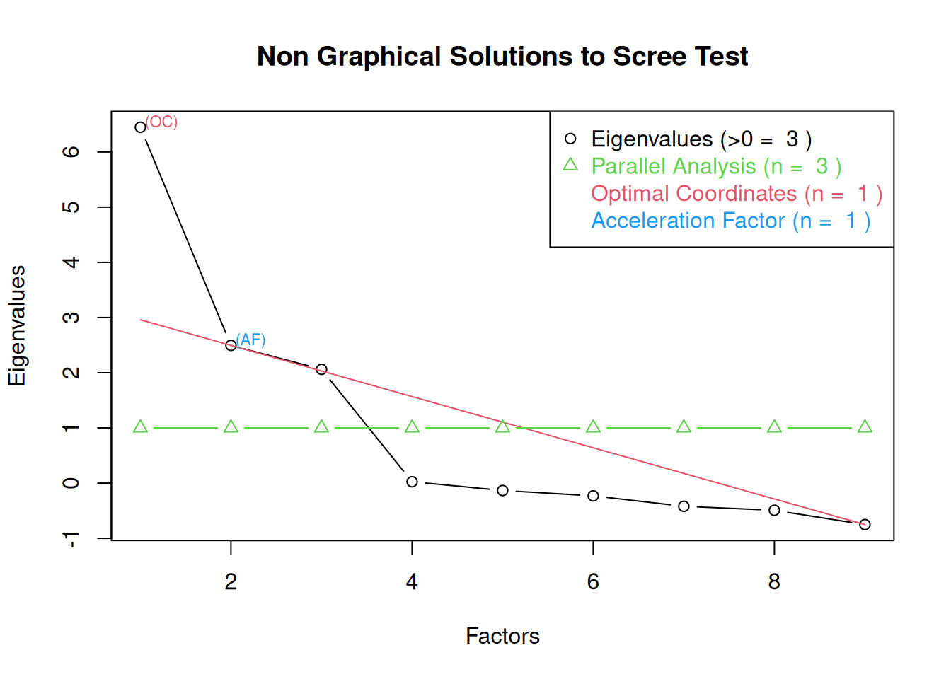 - Cattell’s scree test (Cattell, 1966): the “elbow” (inflection point) in a scree plot minus one; sometimes operationalized with optimal coordinates (OC) or the acceleration factor (AF)