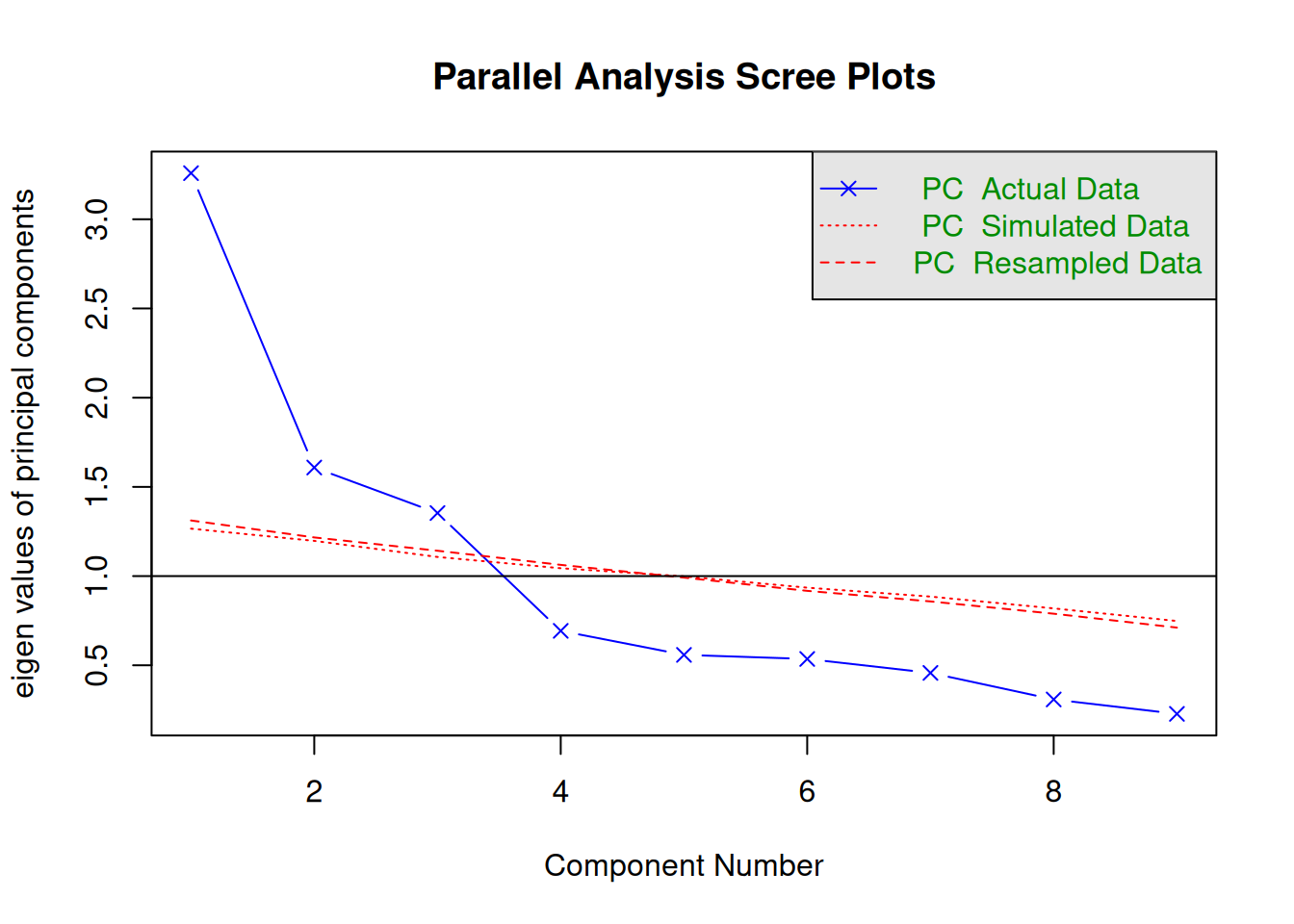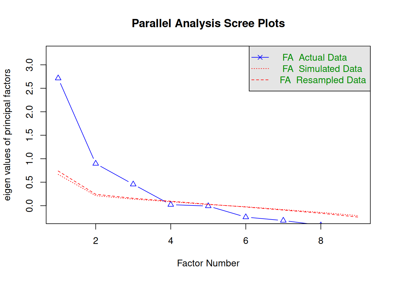 - Parallel analysis: factors that explain more variance than randomly simulated data