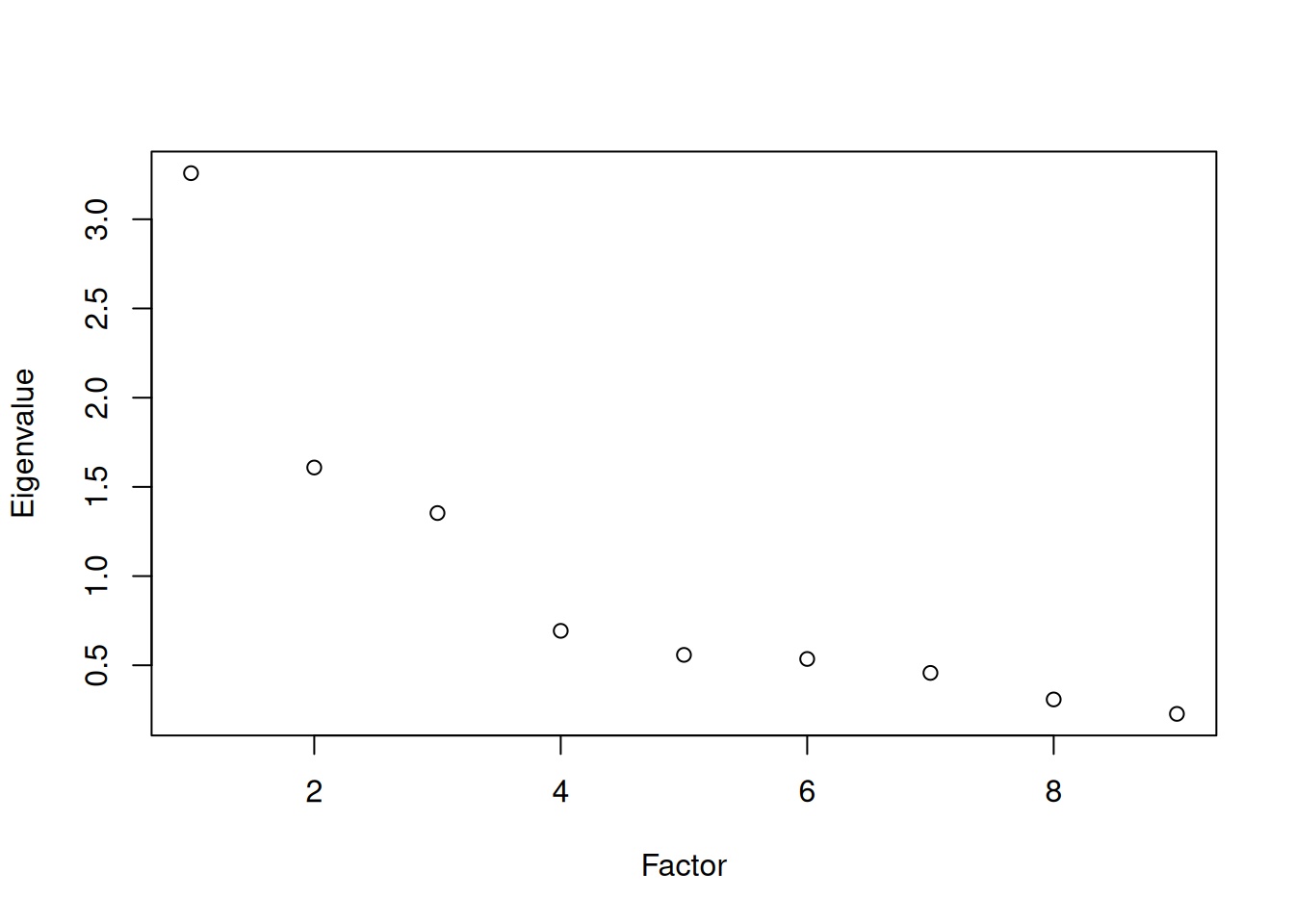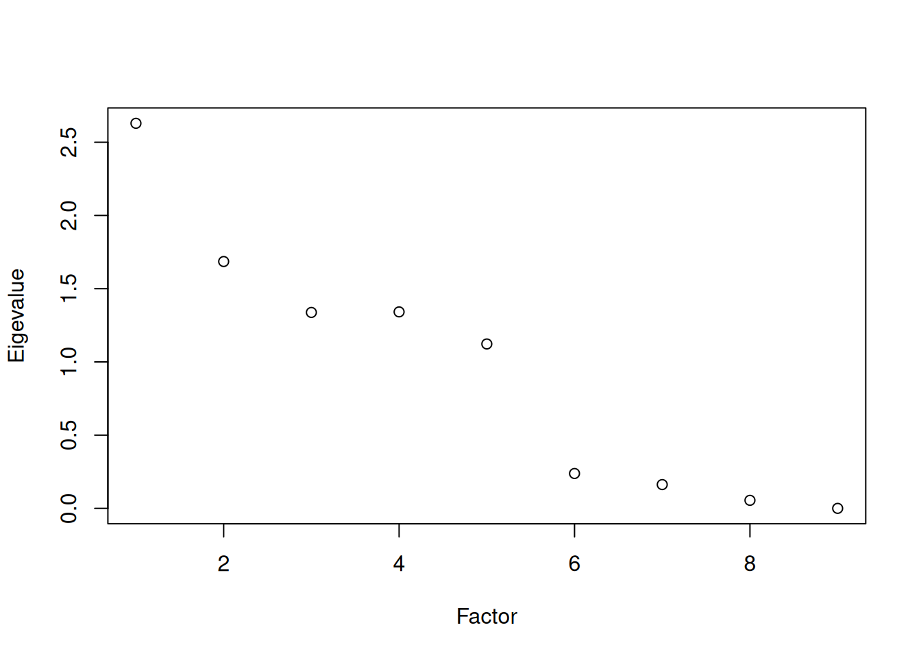 A scree plot from a factor analysis or PCA provides lots of information. A scree plot has the factor number on the x-axis and the eigenvalue on the y-axis. The eigenvalue is the variance accounted for by a factor; when using a varimax (orthogonal) rotation, an eigenvalue (or factor variance) is calculated as the sum of squared standardized factor (or component) loadings on that factor. An example of a scree plot is in Figure 14.14.
