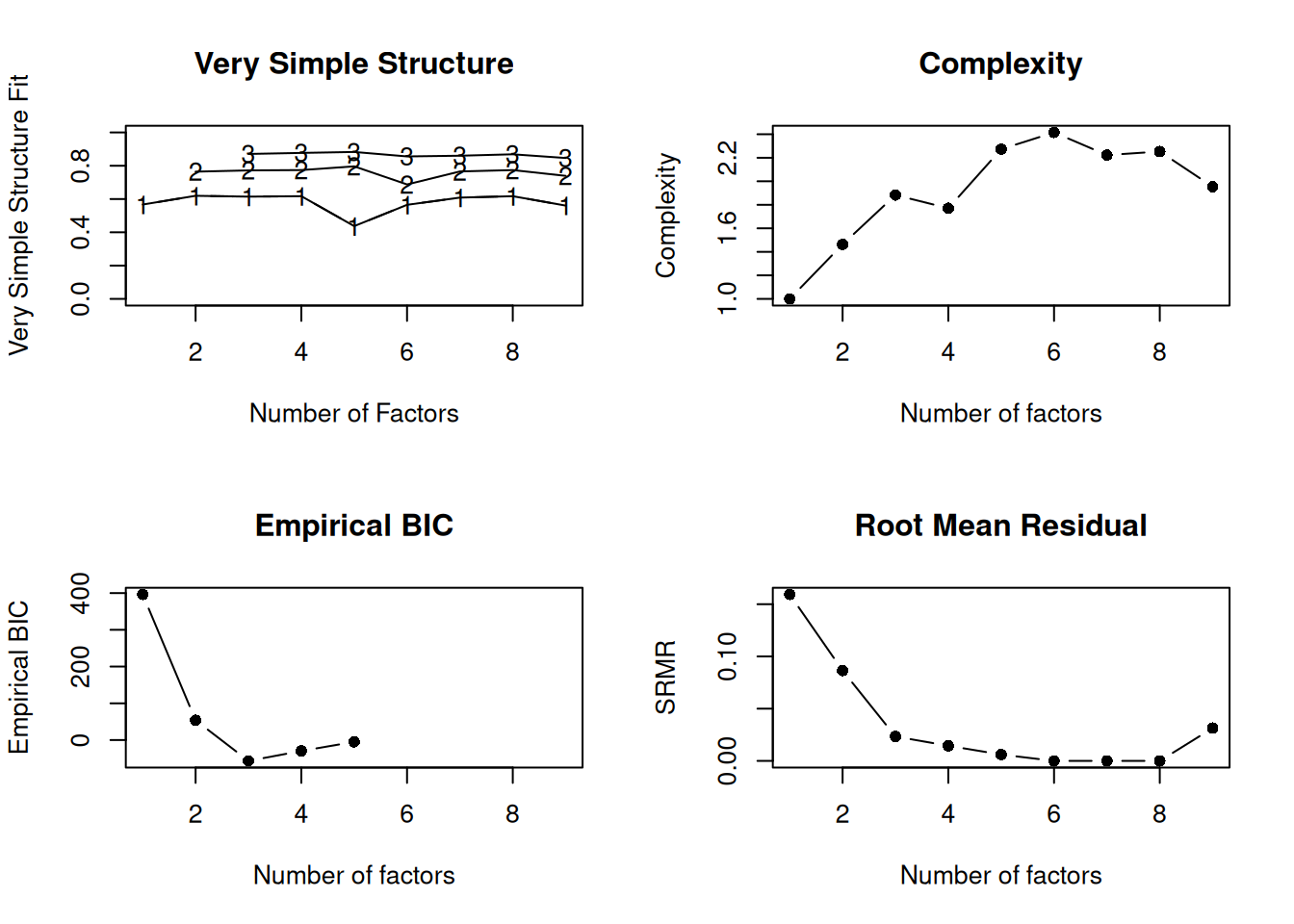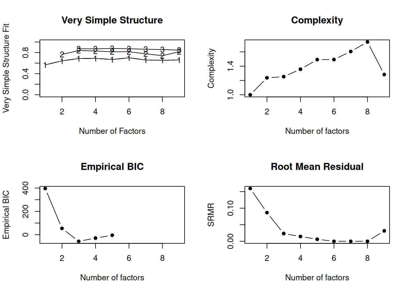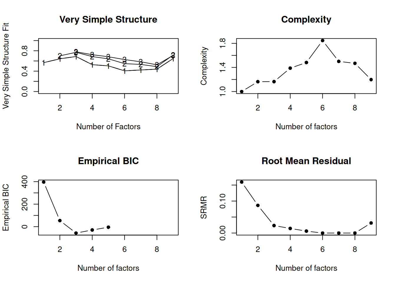 - Velicer’s minimum average partial (MAP) test: smaller is better