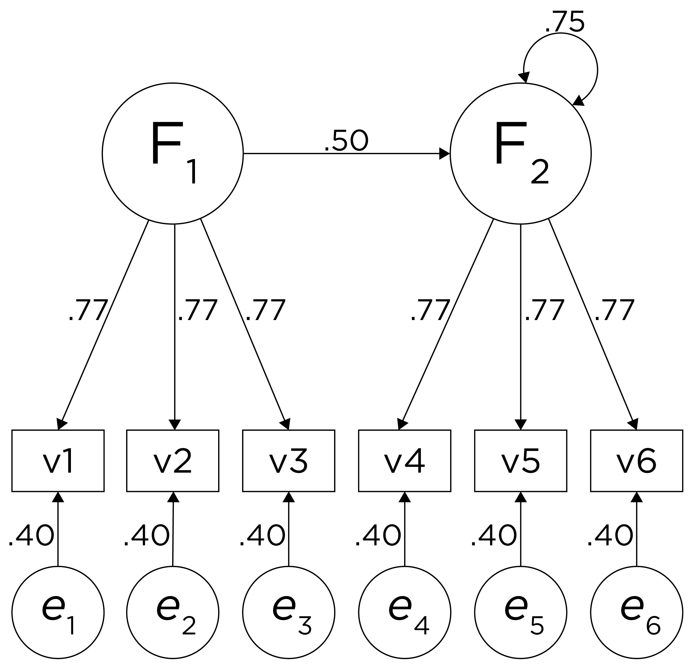 Although going from the model to the correlation matrix is deterministic, going from the correlation matrix to the model is not deterministic. If you know the correlation matrix, there may be many possible models. For instance, the model could also be the one depicted in Figure 14.9, with factor loadings of .77, residual error terms of .40, a regression path of .50, and a disturbance term of .75. The proportion of variance in Factor 2 that is explained by Factor 1 is calculated as: \(.25 = .50 \times .50\). The disturbance term is calculated as \(.75 = 1 - (.50 \times .50) = 1 - .25\). In this model, each latent factor accounts for 60% of the variance in the indicators that load onto it: \(\frac{.77^2 + .77^2 + .77^2}{3} = \frac{.60 + .60 + .60}{3} = .60\). Factor 1 accounts for 15% of the variance in the indicators that load onto Factor 2: \(\frac{(.50^2 \times .77^2) + (.50^2 \times .77^2) + (.50^2 \times .77^2)}{3} = \frac{.15 + .15 + .15}{3} = .15\). This model has the exact same fit as the previous model, but it has different implications. Unlike the previous model, in this model, there is a “causal” pathway from Factor 1 to Factor 2. However, the causal effect of Factor 1 does not account for all of the variance in Factor 2 because the correlation is only .50.