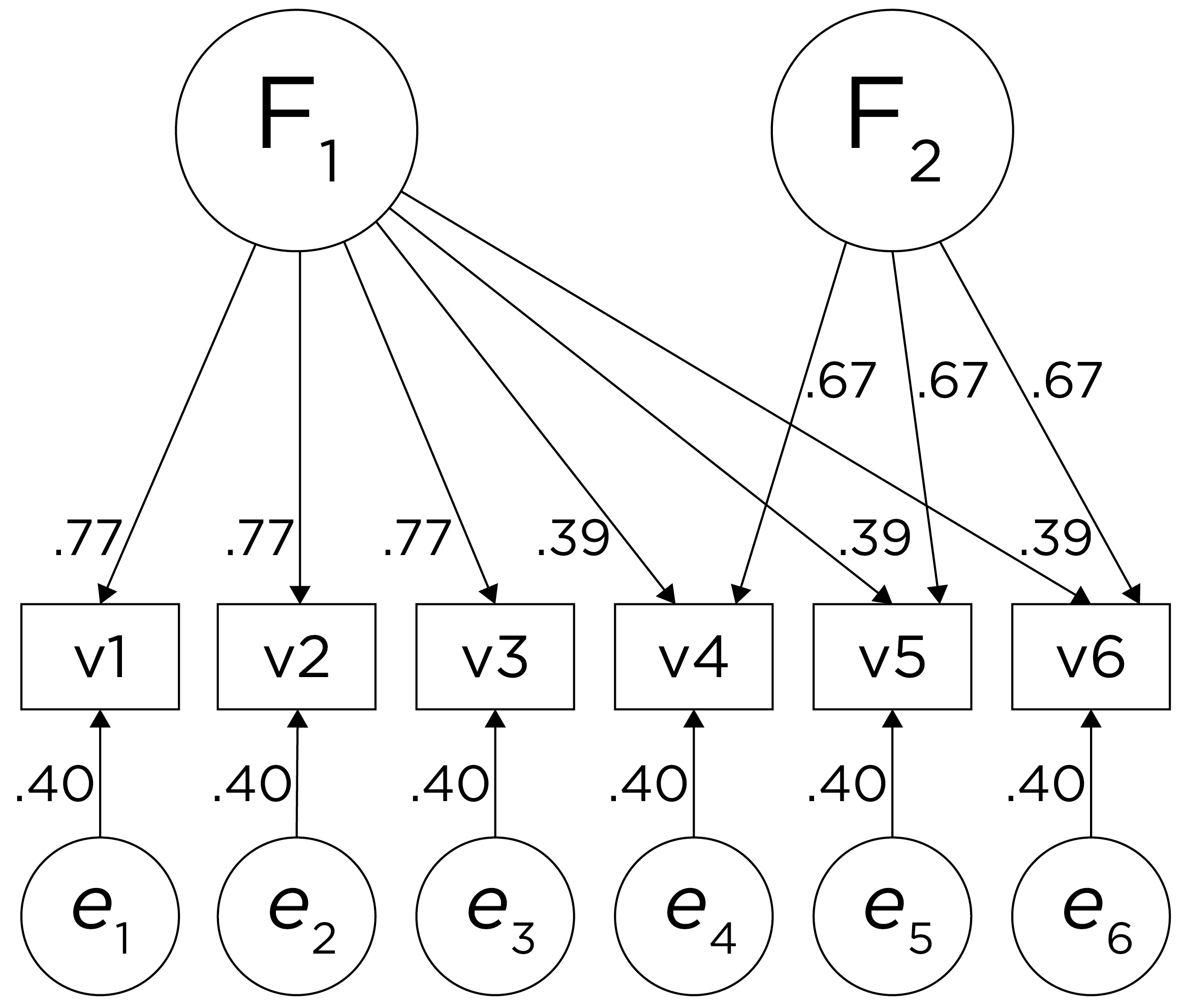 Alternatively, there could be a single factor that influences measures 1, 2, 3, 4, 5, and 6 in addition to a method bias factor (e.g., a particular measurement method, item stem, reverse-worded item, or another method bias) that influences measures 4, 5, and 6 equally, as depicted in Figure 14.12). In this model, measures 4, 5, and 6 have cross-loadings—that is, they load onto more than one latent factor. This model has the exact same fit as the previous models. The amount of common variance (\(R^2\)) that is accounted for by an indicator is estimated as the sum of the squared standardized loadings: \(.60 = .77 \times .77 = (.39 \times .39) + (.67 \times .67)\). The amount of error for an indicator is estimated as: \(\text{error} = 1 - \text{common variance}\), so in this case, the amount of error is: \(.40 = 1 - .60\). Using path tracing rules, the correlation of measures within a factor in this model is calculated as: \(.60 = (.77 \times .77) = (.39 \times .39) + (.67 \times .67)\). The correlation of measures across factors in this model is calculated as: \(.30 = .77 \times .39\). In this model, the first latent factor accounts for 37% of the variance in the indicators: \(\frac{.77^2 + .77^2 + .77^2 + .39^2 + .39^2 + .39^2}{6} = \frac{.59 + .59 + .59 + .15 + .15 + .15}{6} = .30\). The second latent factor accounts for 45% of the variance in its indicators: \(\frac{.67^2 + .67^2 + .67^2}{3} = \frac{.45 + .45 + .45}{3} = .45\).