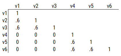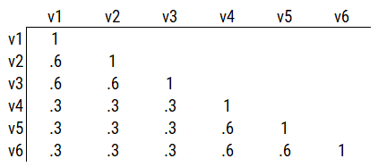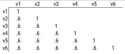 Consider the example correlation matrix in Figure 14.1. Because all of the correlations are the same (\(r = .60\)), we expect there is approximately one factor for this pattern of data.