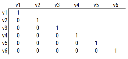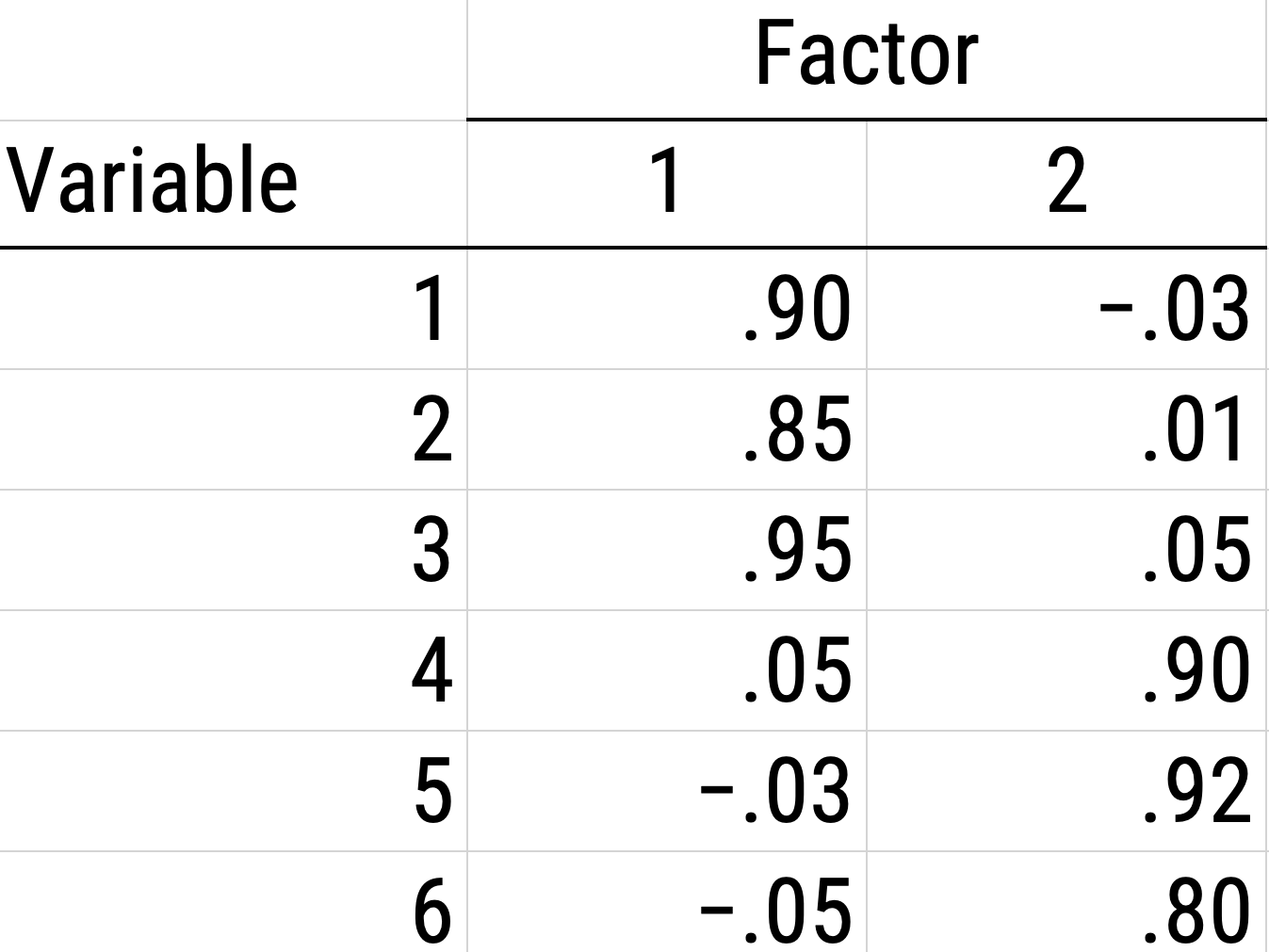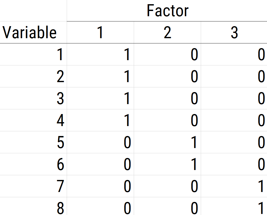 The next step if using EFA or PCA is, possibly, to rotate the factors to make them more interpretable and simple, which is the whole goal. To interpret the results of a factor analysis, we examine the factor matrix. The columns refer to the different factors; the rows refer to the different observed variables. The cells in the table are the factor loadings—they are basically the correlation between the variable and the factor. Our goal is to achieve a model with simple structure because it is easily interpretable. Simple structure means that every variable loads perfectly on one and only one factor, as operationalized by a matrix of factor loadings with values of one and zero and nothing else. An example of a factor matrix that follows simple structure is depicted in Figure 14.15.