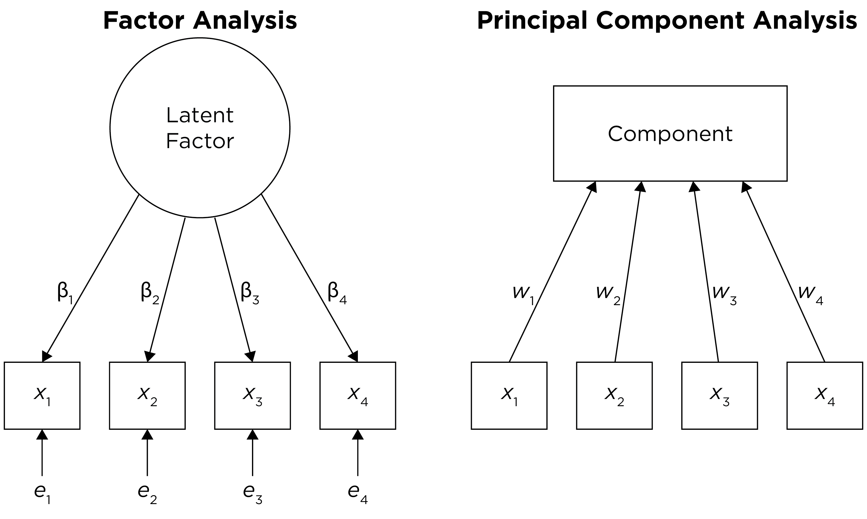 Factor analysis involves observed (manifest) variables and unobserved (latent) factors. In a reflective model, it is assumed that the latent factor influences the manifest variables, and the latent factor therefore reflects the common (reliable) variance among the variables. A factor model potentially includes factor loadings, residuals (errors or disturbances), intercepts/means, covariances, and regression paths. A regression path indicates a hypothesis that one variable (or factor) influences another. The standardized regression coefficient represents the strength of association between the variables or factors. A factor loading is a regression path from a latent factor to an observed (manifest) variable. The standardized factor loading represents the strength of association between the variable and the latent factor. A residual is variance in a variable (or factor) that is unexplained by other variables or factors. An indicator’s intercept is the expected value of the variable when the factor(s) (onto which it loads) is equal to zero. Covariances are the associations between variables (or factors). A covariance path between two variables represents omitted shared cause(s) of the variables. For instance, if you depict a covariance path between two variables, it means that there is a shared cause of the two variables that is omitted from the model (for instance, if the common cause is not known or was not assessed).