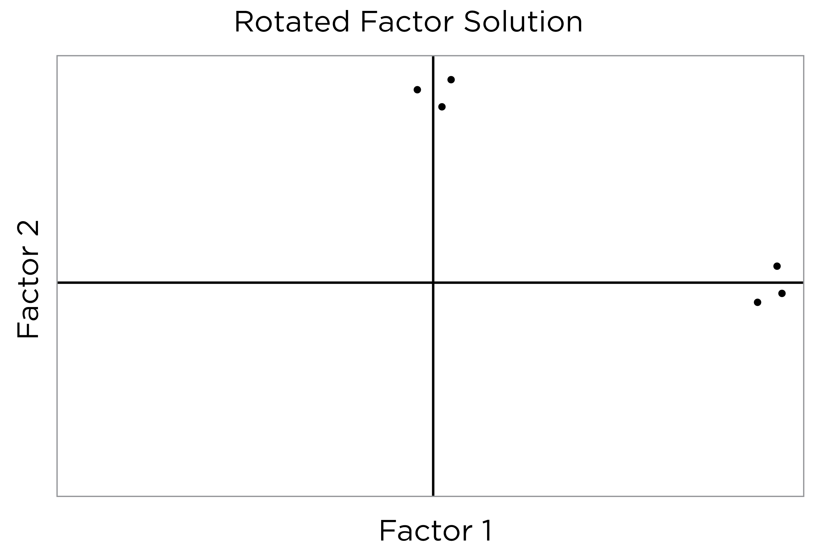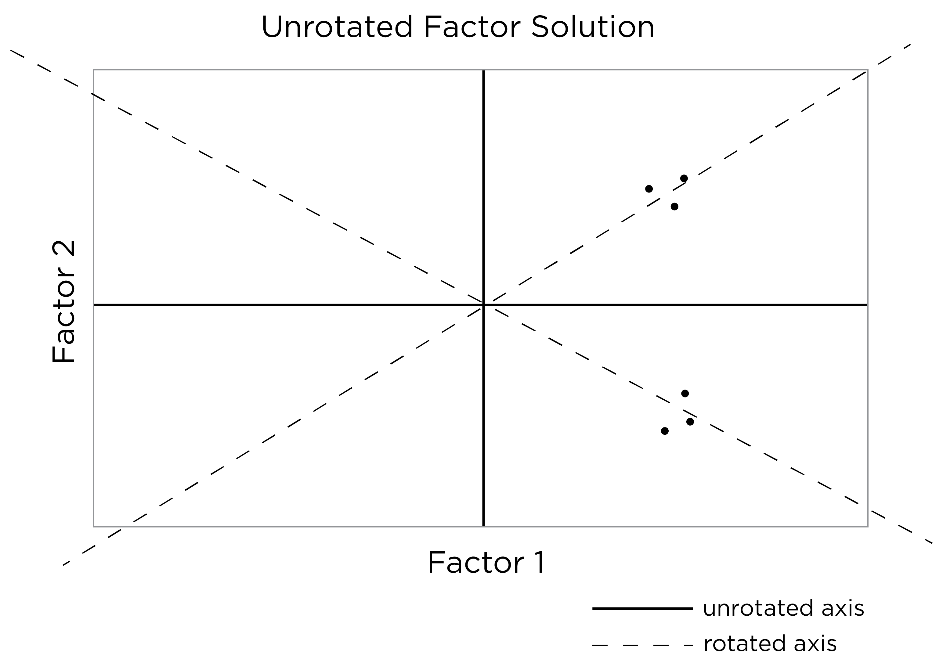 In the example factor matrix in Figure 14.18), the factor analysis is not very helpful—it tells us very little because it did not distinguish between the two factors. The variables have similar loadings on Factor 1 and Factor 2. An example of a unrotated factor solution is in Figure 14.19. In the figure, all of the variables are in the midst of the quadrants—they are not on the factors’ axes. Thus, the factors are not very informative.