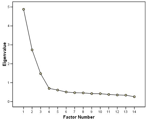 Another criterion is Cattell’s scree test (Cattell, 1966), which involves selecting the number of factors from looking at the scree plot. “Scree” refers to the rubble of stones at the bottom of a mountain. According to Cattell’s scree test, you should keep the factors before the last steep drop in eigenvalues—i.e., the factors before the rubble, where the slope approaches zero. The beginning of the scree (or rubble), where the slope approaches zero, is called the “elbow” of a scree plot. Using Cattell’s scree test, you retain the number of factors that explain the most variance prior to the explained variance drop-off, because, ultimately, you want to include only as many factors in which you gain substantially more by the inclusion of these factors. That is, you would keep the number of factors at the elbow of the scree plot minus one. If the last steep drop occurs from Factor 4 to Factor 5 and the elbow is at Factor 5, we would keep four factors. In Figure 14.14, the last steep drop in eigenvalues occurs from Factor 3 to Factor 4; the elbow of the scree plot occurs at Factor 4. We would keep the number of factors at the elbow minus one. Thus, using Cattell’s scree test, we would keep three factors based on Figure 14.14.