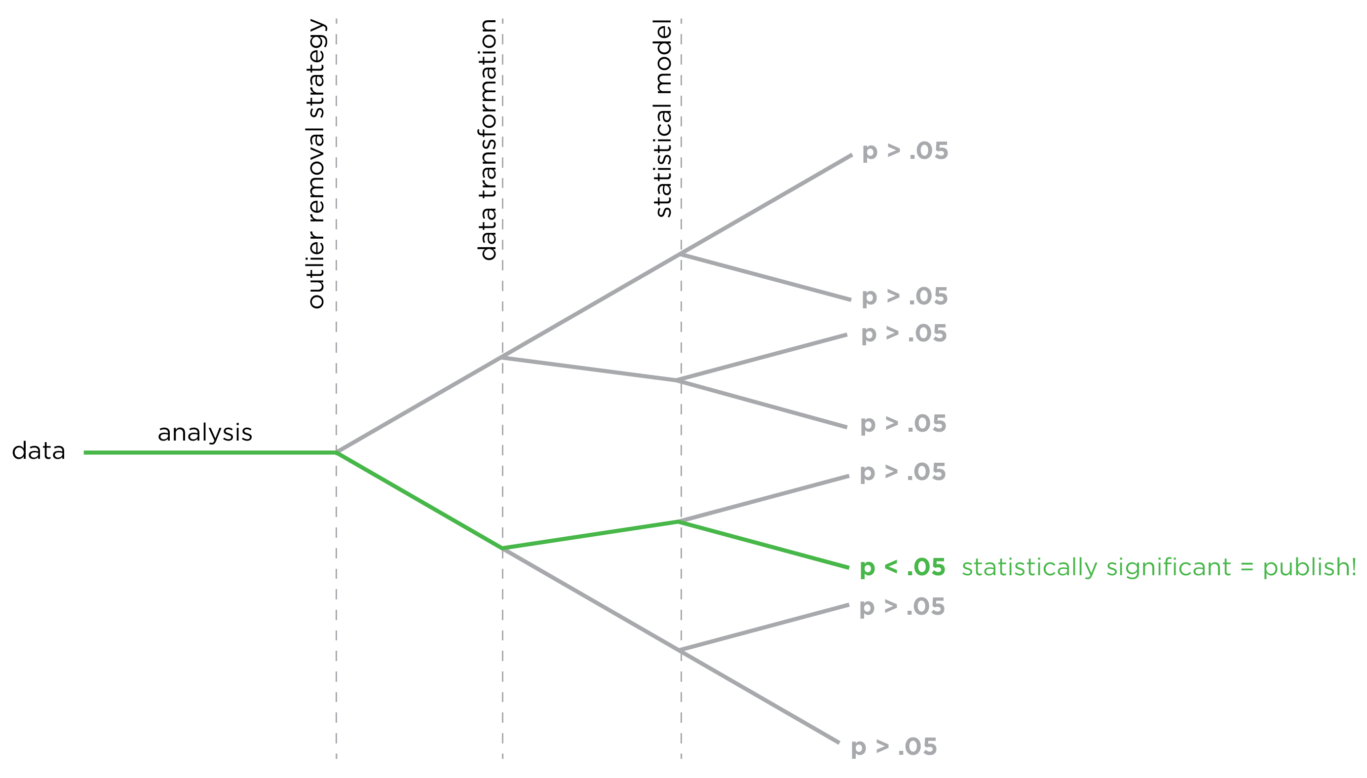 Many domains of science, particularly social science, have struggled with a replication crisis, such that a large proportion of findings fail to replicate when independent investigators attempt to replicate the original findings (Duncan et al., 2014; Freese & Peterson, 2017; Larson & Carbine, 2017; Lilienfeld, 2017; Open Science Collaboration, 2015; Shrout & Rodgers, 2018; Tackett, Brandes, King, et al., 2019). There is considerable speculation on what factors account for the replication crisis. For instance, one possible factor is the researcher degrees of freedom, which are unacknowledged choices in how researchers prepare, analyze, and report their data that can lead to detecting significance in the absence of real effects (Loken & Gelman, 2017). This is similar to Gelman & Loken (2013)’s description of research as the garden of forking paths, where different decisions along the way can lead to different outcomes (see Figure 1.1). A second possibility for the replication crisis is that some replication studies have had limited statistical power (e.g., insufficiently large sample sizes). A third possibility may be that there is publication bias such that researchers tend to publish only significant findings, which is known as the file-drawer effect. A fourth possibility is that researchers may engage in ethically questionable research practices, such as multiple testing and selective reporting.
