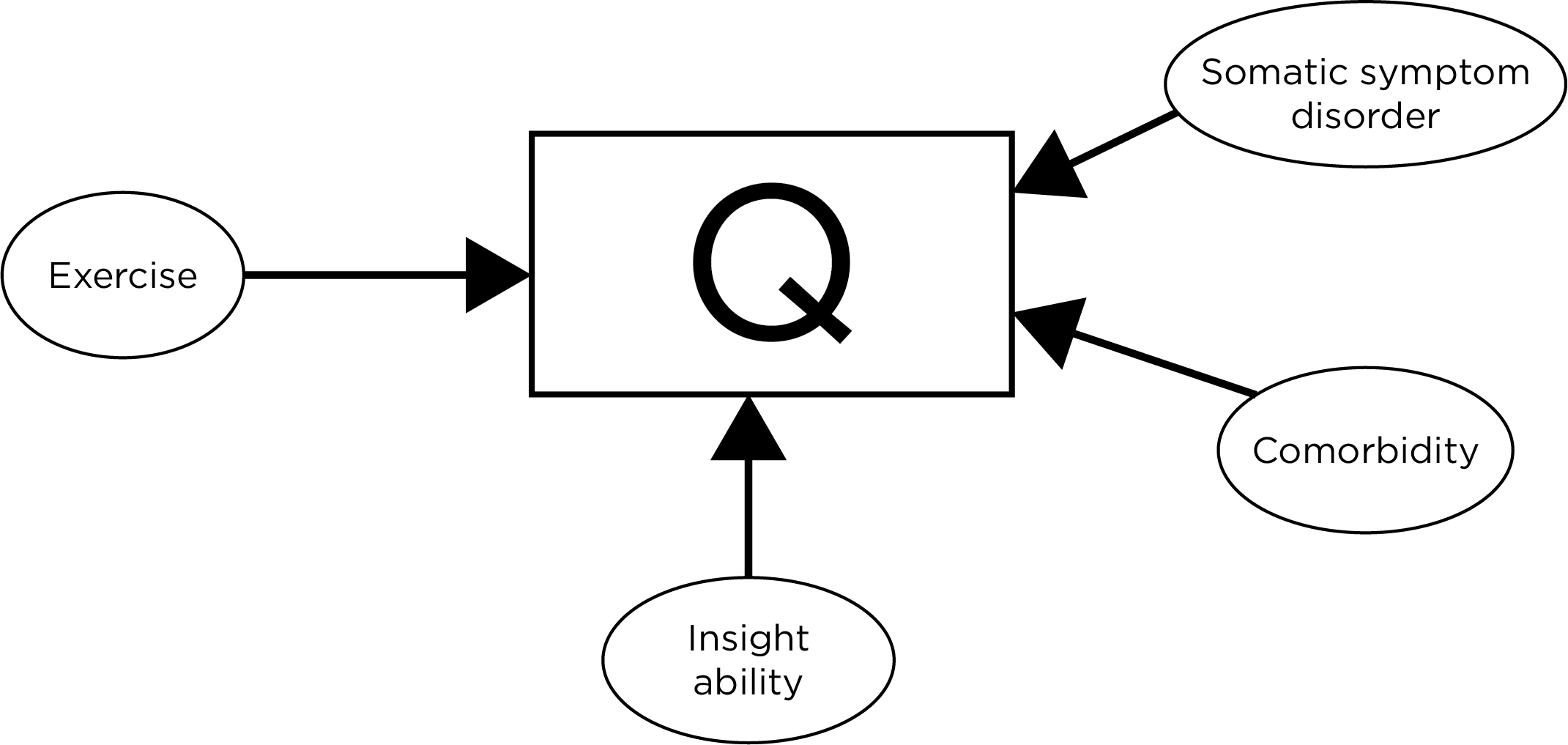 The MMPI is an example of a so-called “objective” personality test. But the MMPI and other objective personality tests are not truly objective. Consider an example of a True/False item from the MMPI: “I hardly ever notice my heart pounding and I am seldom short of breath”. The item is intended to assess somatic symptom disorder, with a response of “false” being more indicative of disorder. But there are other factors that could influence a person’s response to the question besides whether the person has somatic symptom disorder. Figure 18.1 depicts how a person’s response to the question could be influenced by several factors. A comorbidity of somatic symptom disorder could make it more likely that a person answers with a response of “false”, in line with somatic symptom disorder. In addition, a person’s insight ability may influence whether they answer with a response of “false”. Also, people who exercise more may experience a pounding heart and shortness of breath more frequently (i.e., while exercising), and therefore answer with a response of “false”. In sum, the item and the test as a whole is clearly not “objective” because constructs in the questions are not clearly defined. What does a “pounding heart” mean? How much is “hardly ever”? People may define “seldom” differently.