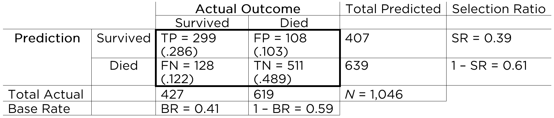 : 2x2 Prediction Matrix With Marginal Sums And Marginal Probabilities. TP = true positives; TN = true negatives; FP = false positives; FN = false negatives; BR = base rate; SR = selection ratio.](images/2x2-Matrix_2c.png)