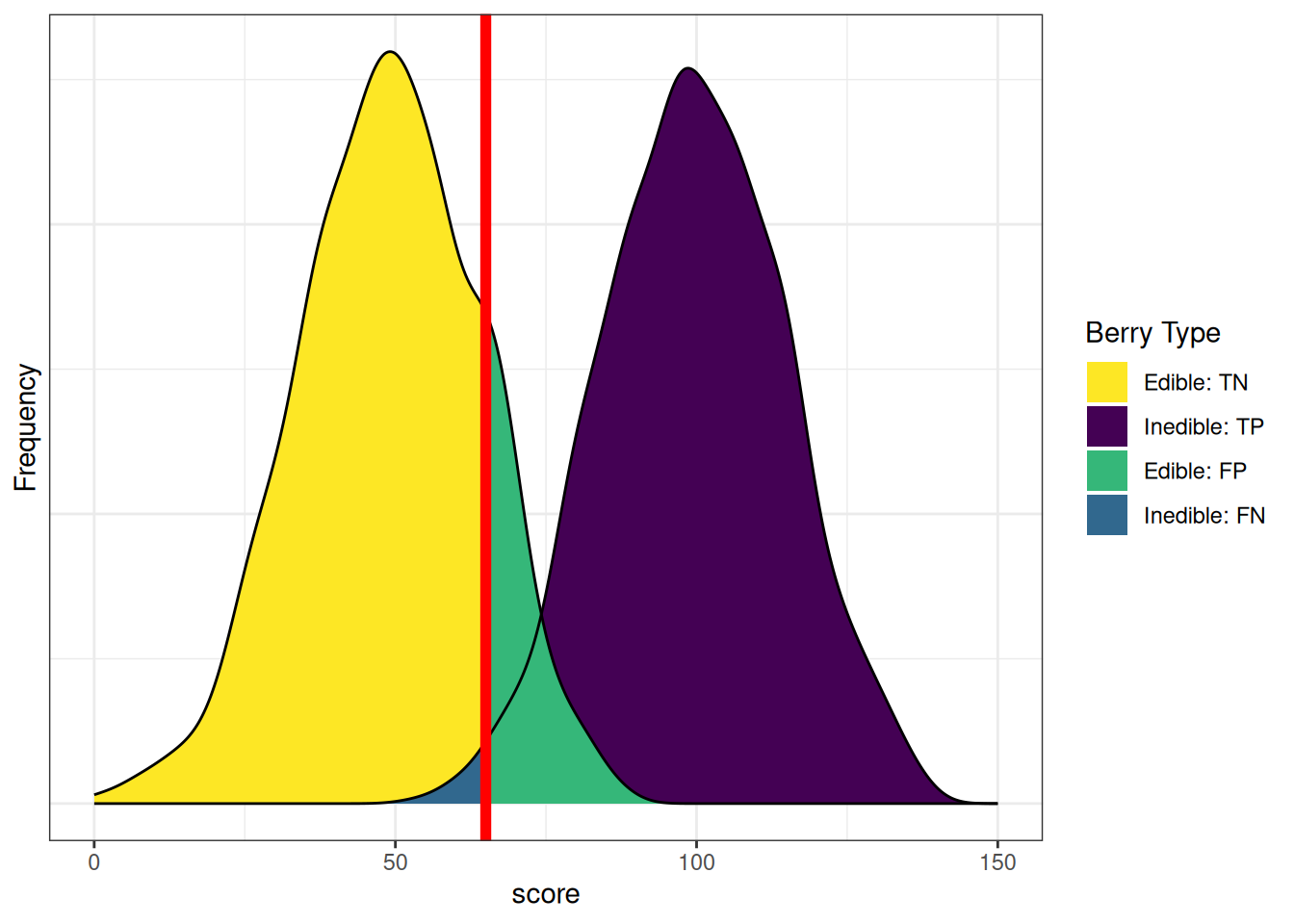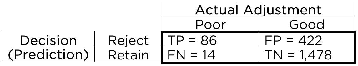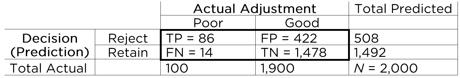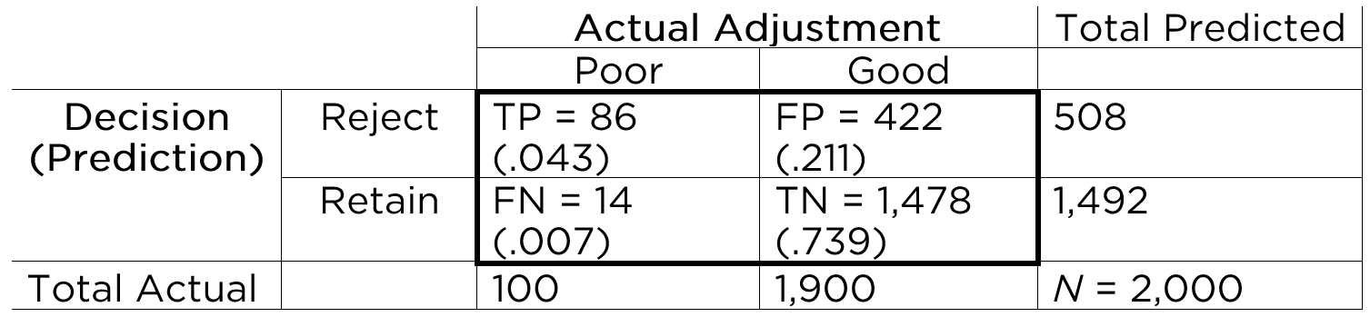 That is, we can sum across the rows and columns to identify how many people actually showed poor adjustment (\(n = 100\)) versus good adjustment (\(n = 1,900\)), and how many people were selected to reject (\(n = 508\)) versus retain (\(n = 1,492\)). If we sum the column of predicted marginal sums (\(508 + 1,492\)) or the row of actual marginal sums (\(100 + 1,900\)), we get the total number of people (\(N = 2,000\)).