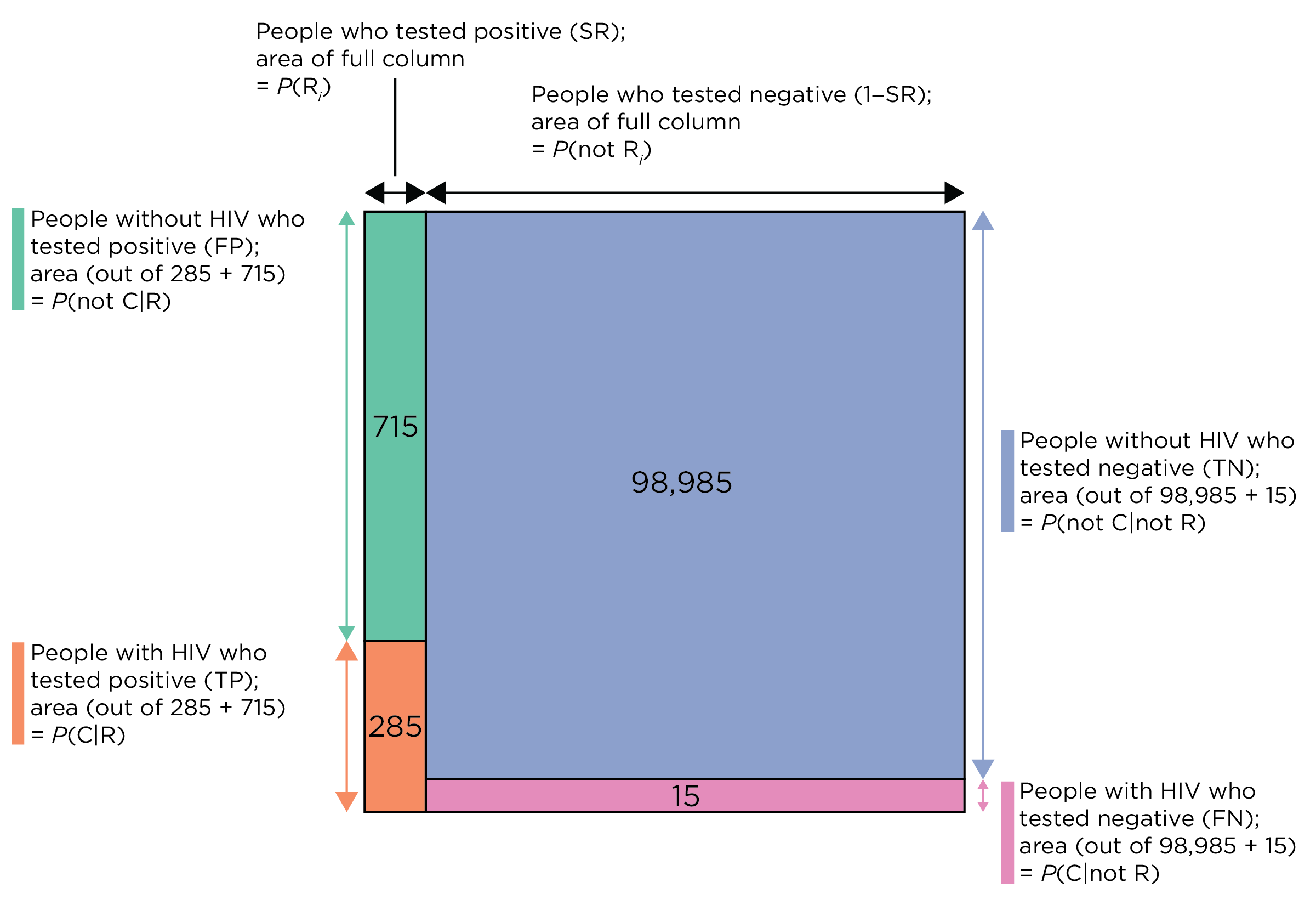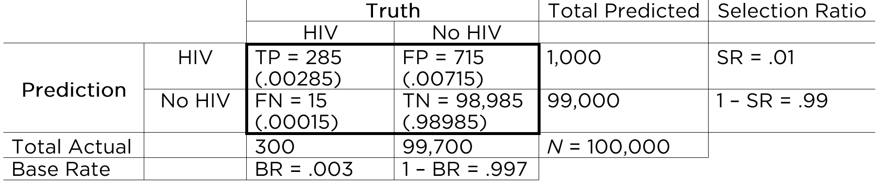 We know that .3% of the population contracts HIV, so 300 people in the population of 100,000 would contract HIV. Therefore, we put 300 in the marginal sum of those with HIV (\(.003 \times 100,000 = 300\)), i.e., the base rate of HIV. That means 99,700 people do not contract HIV (\(100,000 - 300 = 99,700\)). We know that 1% of the population tests positive for HIV, so we put 1,000 in the marginal sum of those who test positive \(.01 \times 100,000 = 1,000\), i.e., the marginal probability of a positive test (the selection ratio). That means 99,000 people test negative for HIV (\(100,000 - 1,000 = 99,000\)). We also know that 95% of those who have HIV test positive for HIV. Three hundred people have HIV, so 95% of them (i.e., 285 people; \(.95 \times 300 = 285\)) tested positive for HIV (true positives). Because we know that 300 people have HIV and that 285 of those with HIV tested positive, that means that 15 people with HIV tested negative (\(300 - 15 = 285\); false negatives). We know that 1,000 people tested positive for HIV, and 285 with HIV tested positive, so that means that 715 people without HIV tested positive (\(1,000 - 285 = 715\); false positives). We know that 99,000 people tested negative for HIV, and 15 with HIV tested negative, so that means that 98,985 people without HIV tested negative (\(99,000 - 15 = 98,985\); true negatives). So, to answer the question of what is the probability of having HIV if you have a positive test, we divide the number of people with HIV who had a positive test (285) by the total number of people who had a positive test (1000), which leads to a probability of 28.5%.