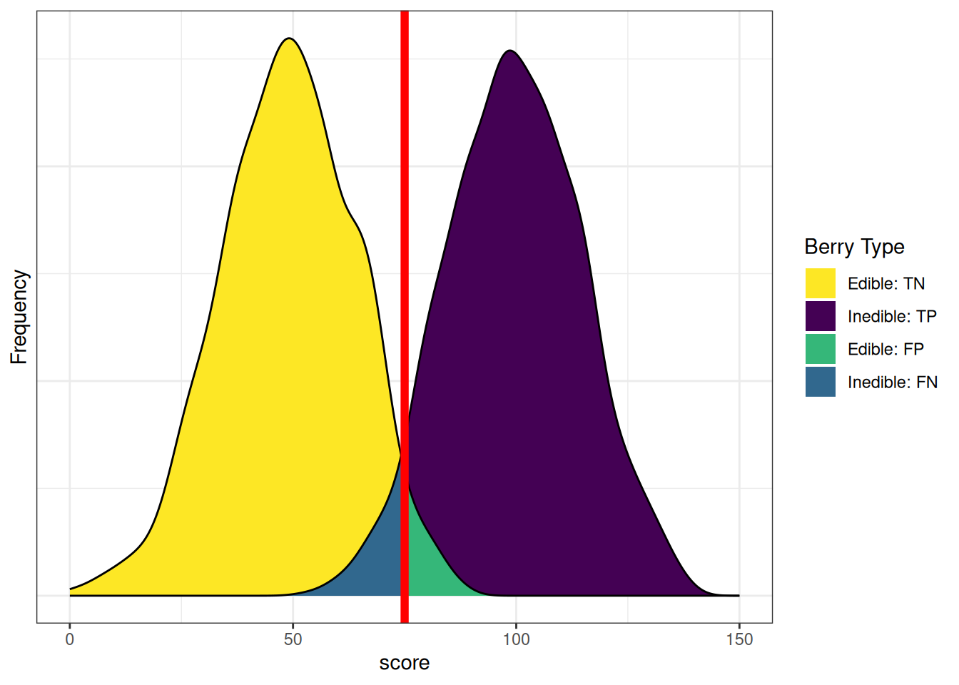 Based on the confusion matrix, we can calculate the prediction accuracy based on the percent accuracy of the predictions. The percent accuracy is the number of correct predictions divided by the total number of predictions, and multiplied by 100. In the context of a confusion matrix, this is calculated as: \(100\% \times \frac{\text{TP} + \text{TN}}{N}\). In this case, our percent accuracy was 78%—that is, 78% of our predictions were accurate, and 22% of our predictions were inaccurate.