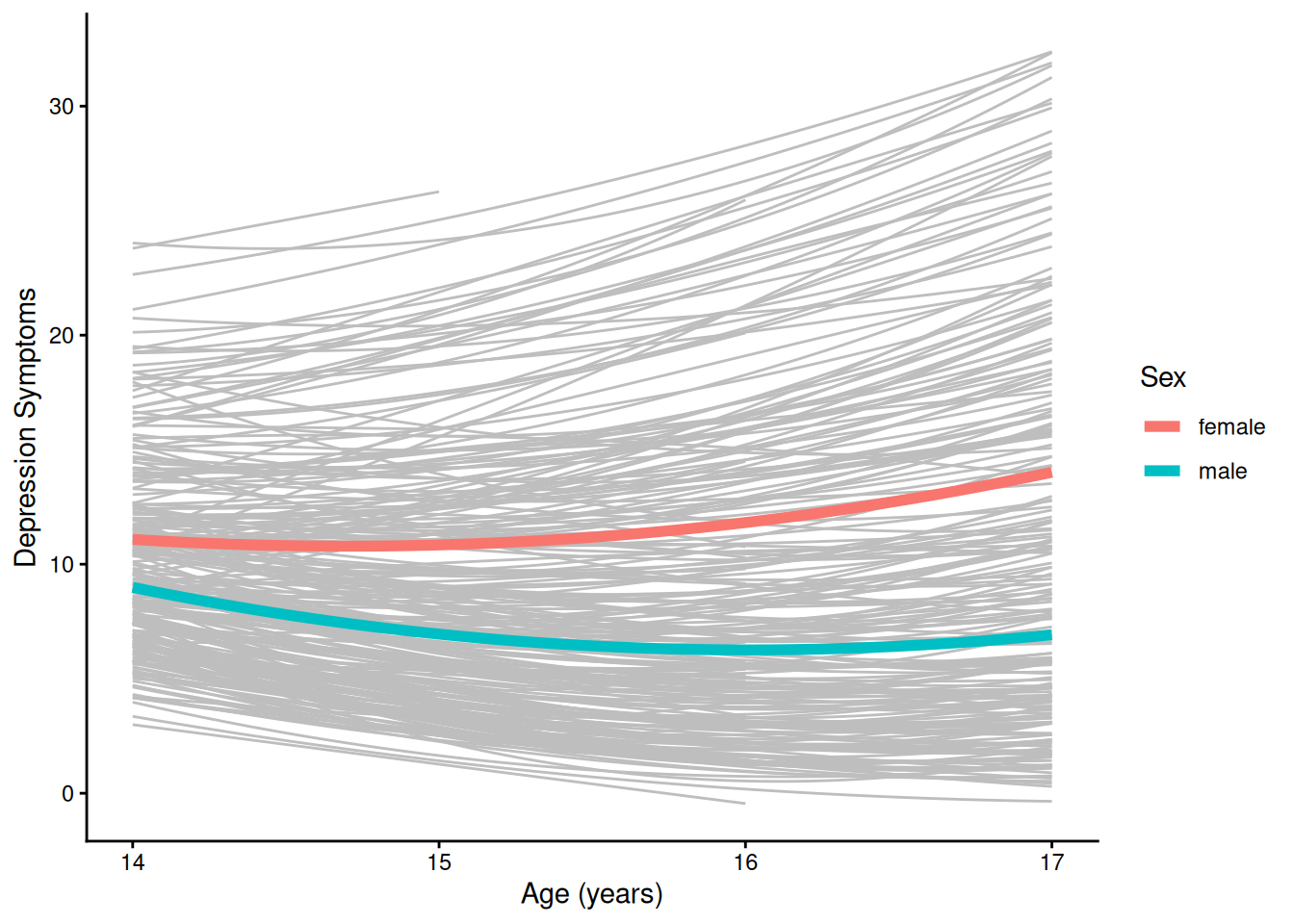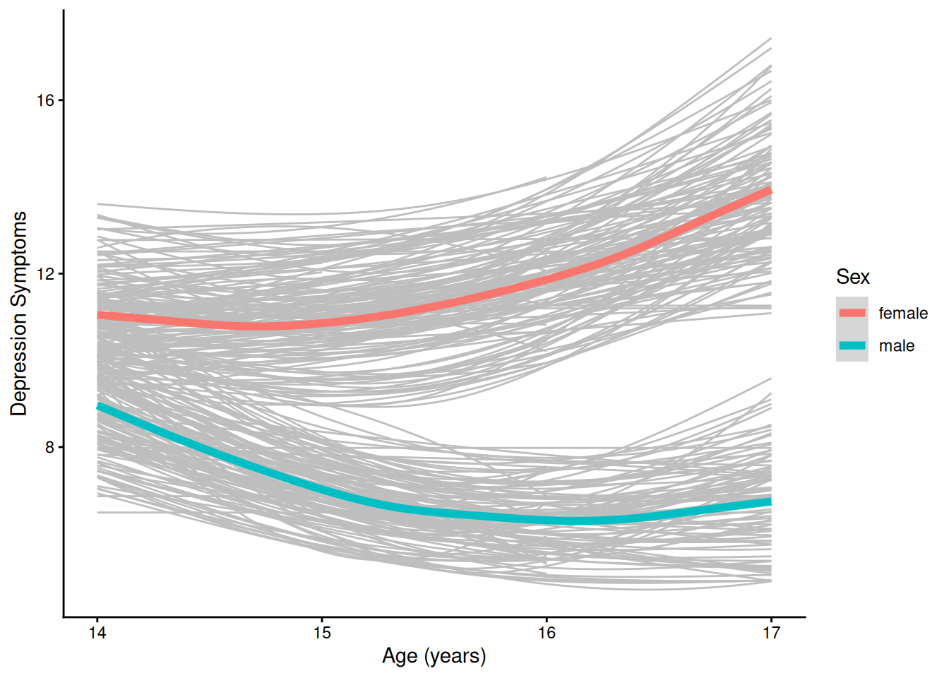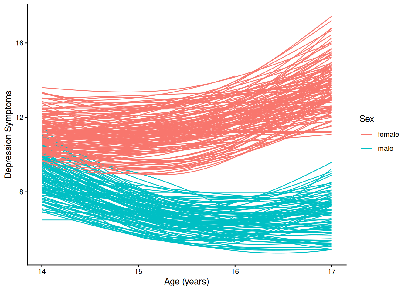 #| fig-cap: "Individuals' Model-Implied Growth Curves of Depression Symptoms Overlaid With Prototypical Growth Curves By Sex"