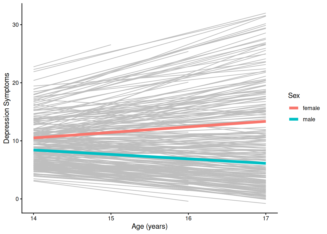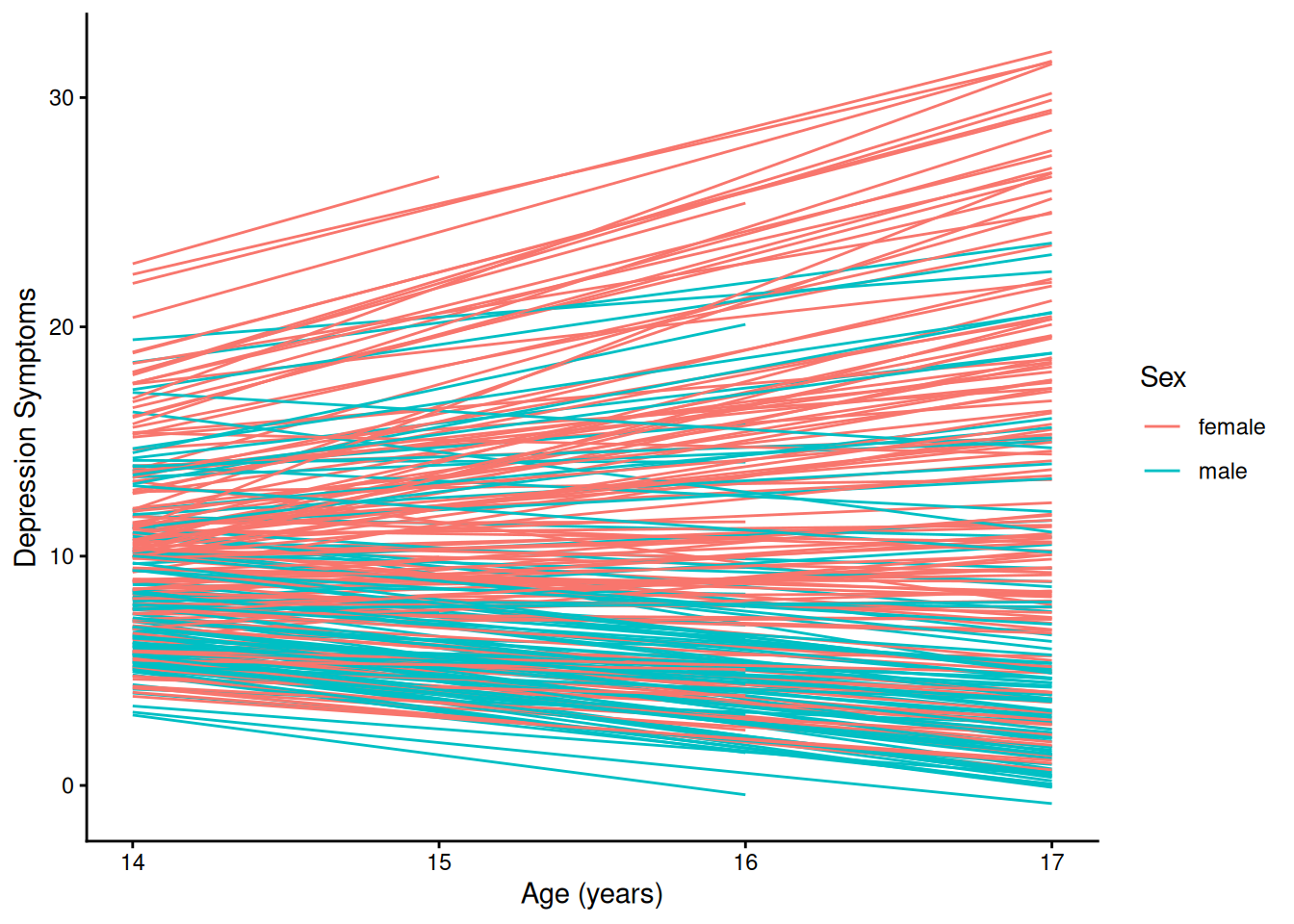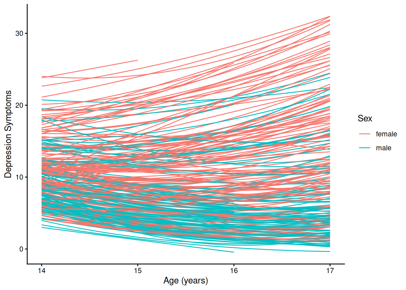 #| fig-cap: "Individuals' Model-Implied Growth Curves of Depression Symptoms Overlaid With Prototypical Growth Curves By Sex"