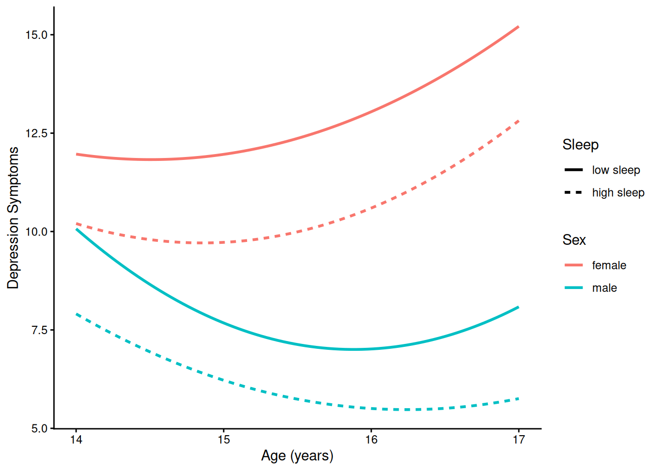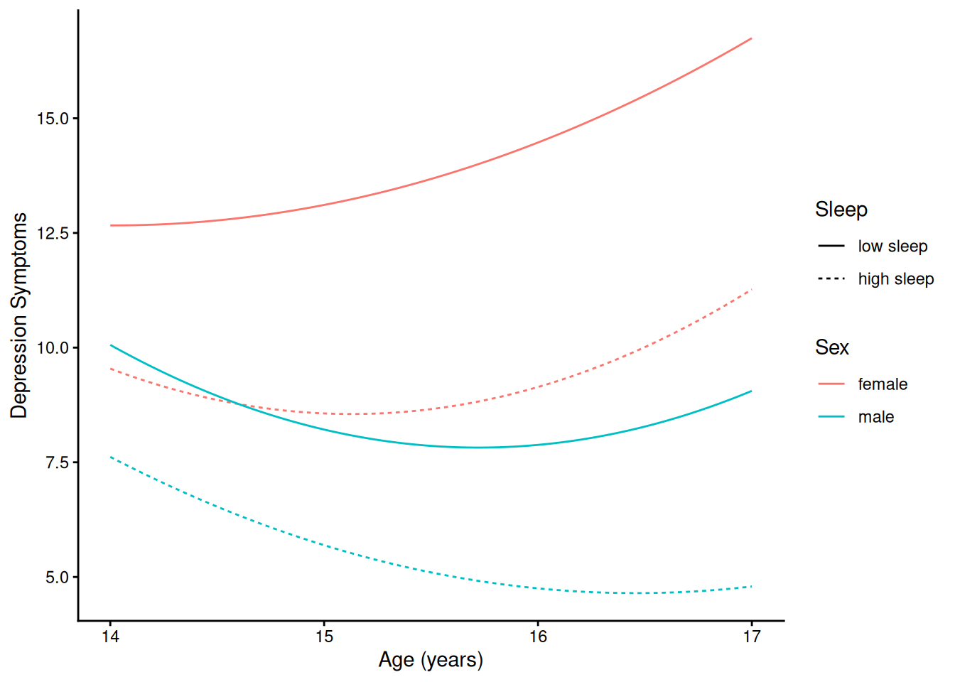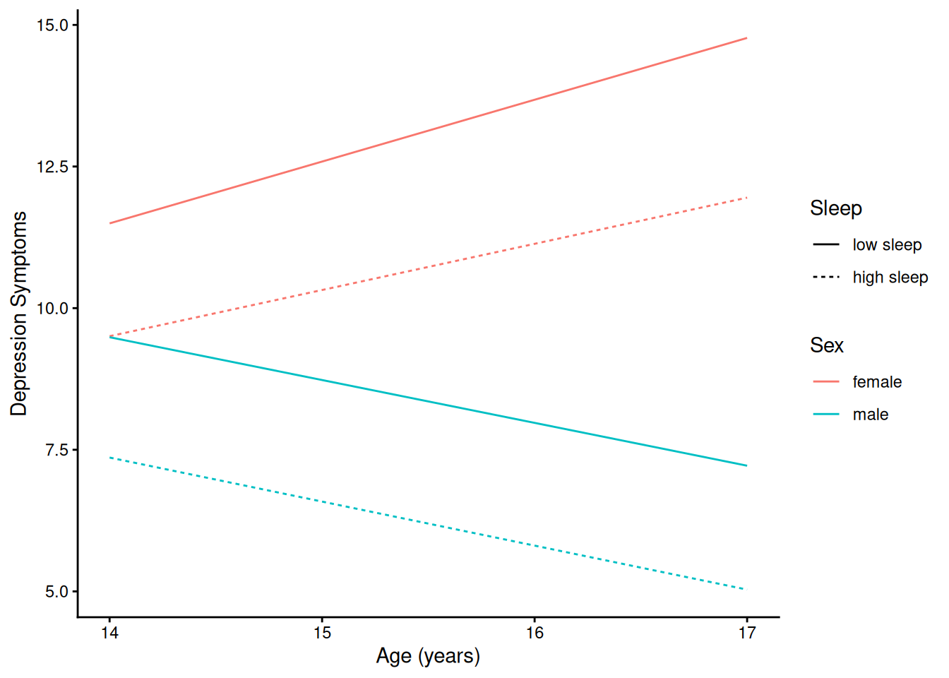#| fig-cap: "Prototypical Model-Implied Growth Curves of Depression Symptoms By Sex and Sleep"