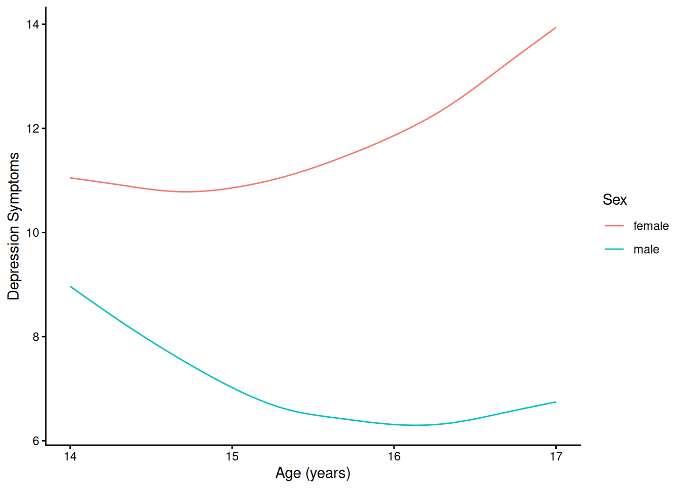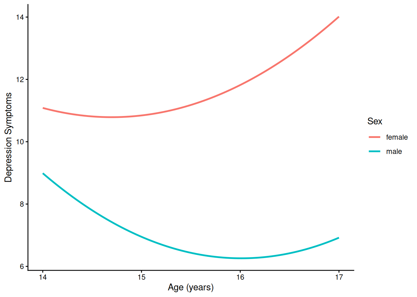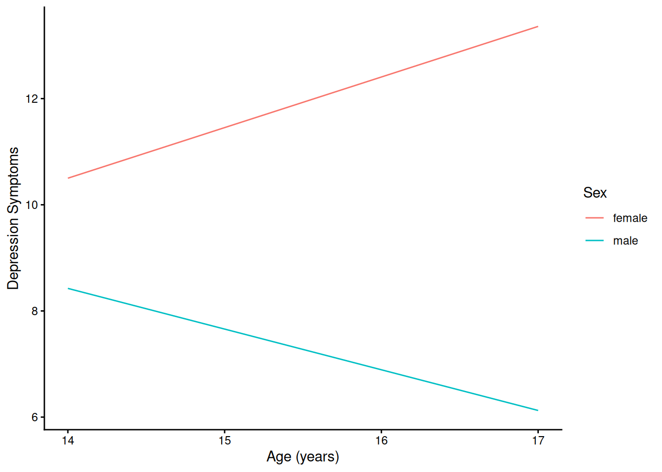 #| fig-cap: "Prototypical Model-Implied Growth Curves of Depression Symptoms By Sex"