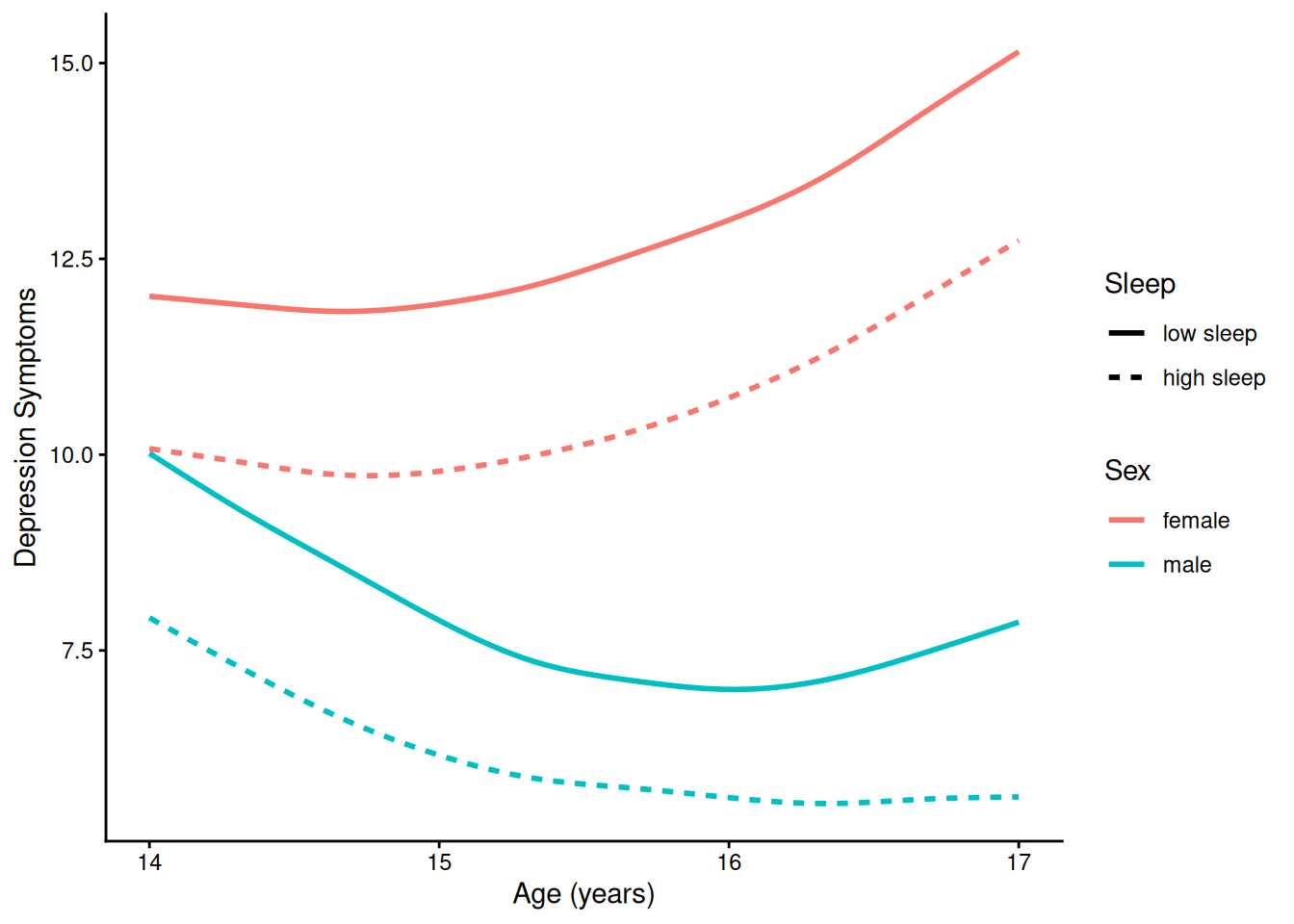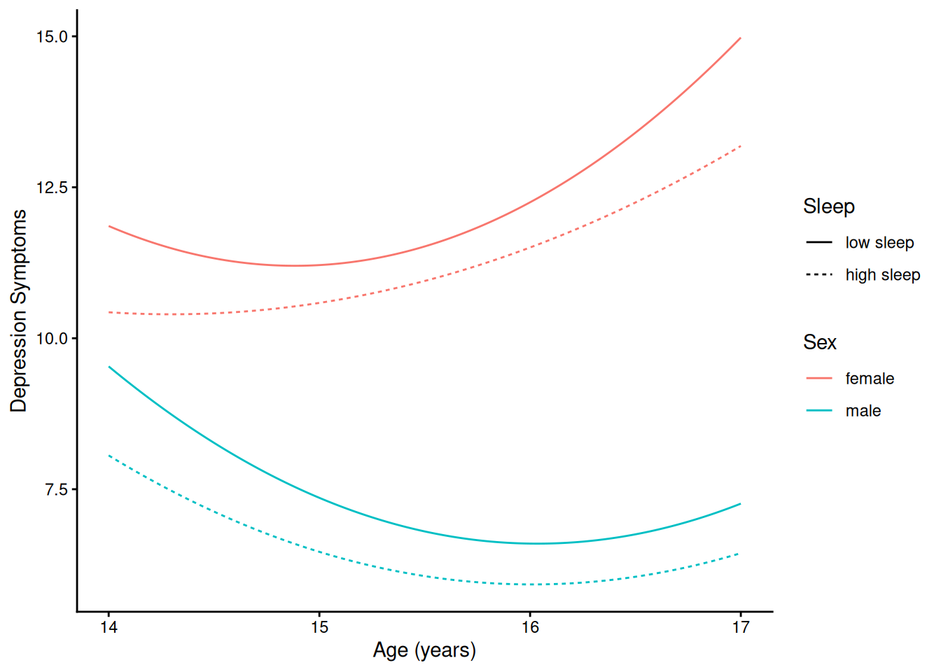 1. Does the association between sleep and depressive symptoms differ between boys and girls?
